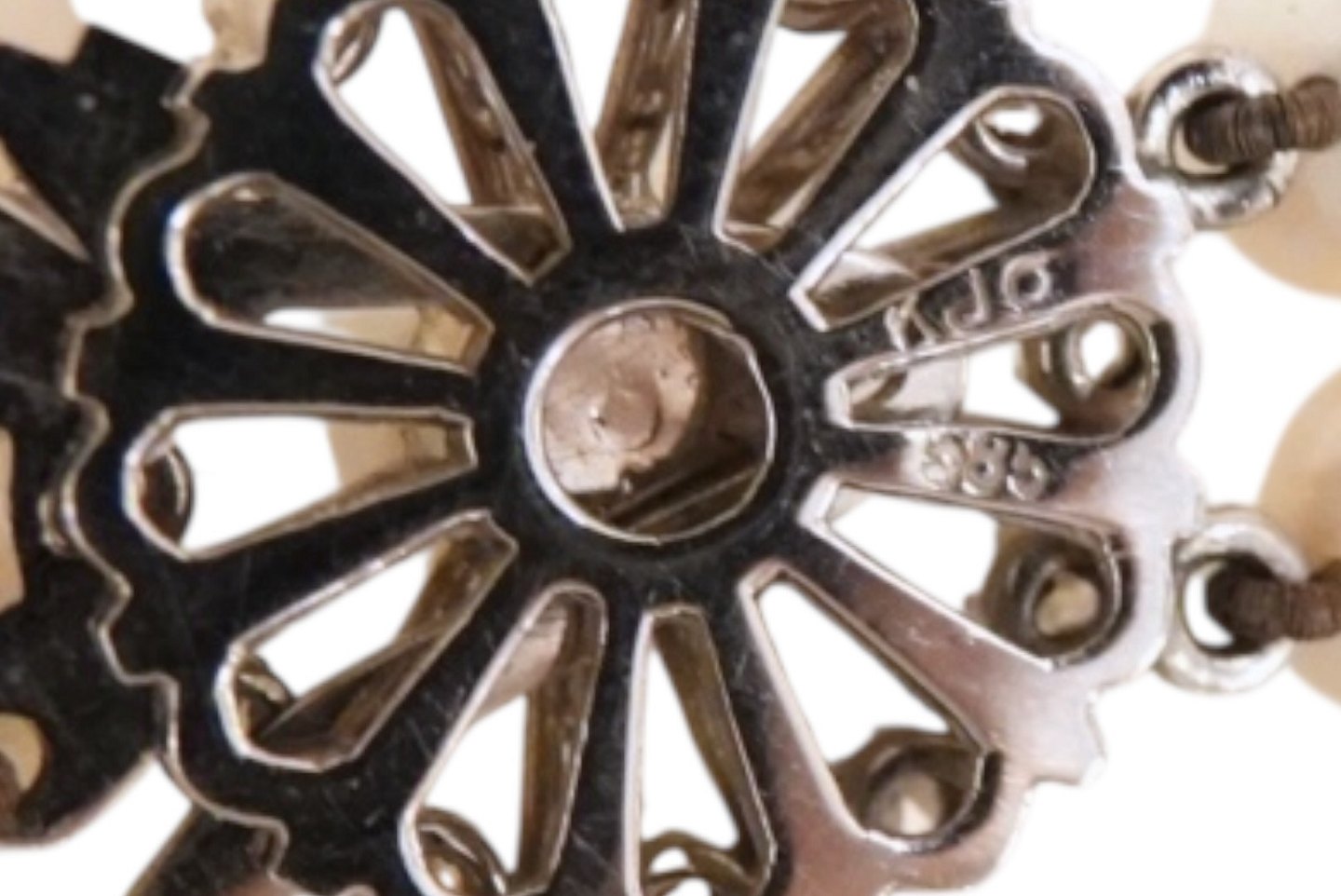 Vedhænget er indfattet i 14 karat hvidglud og flankeret af brillianter / diamanter.