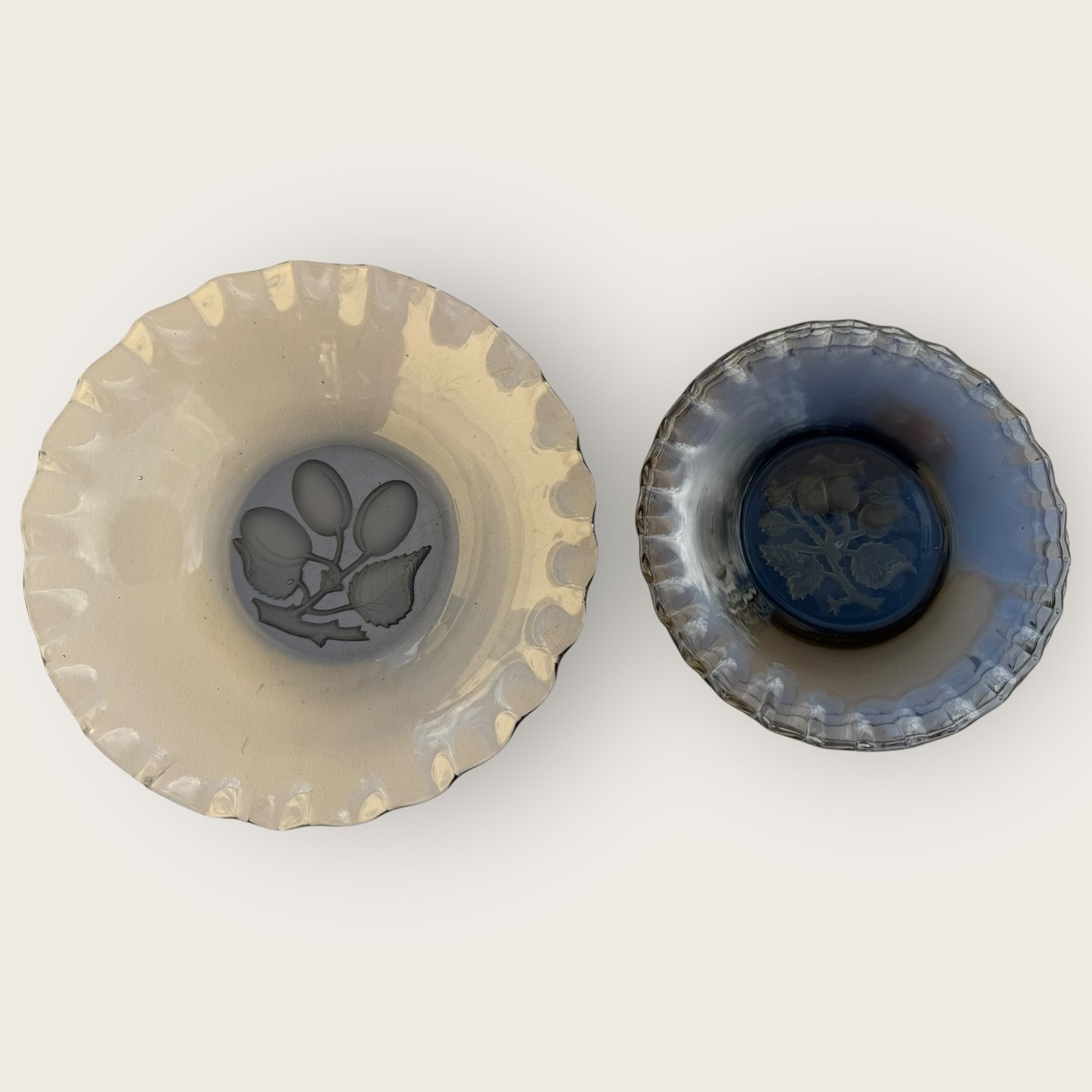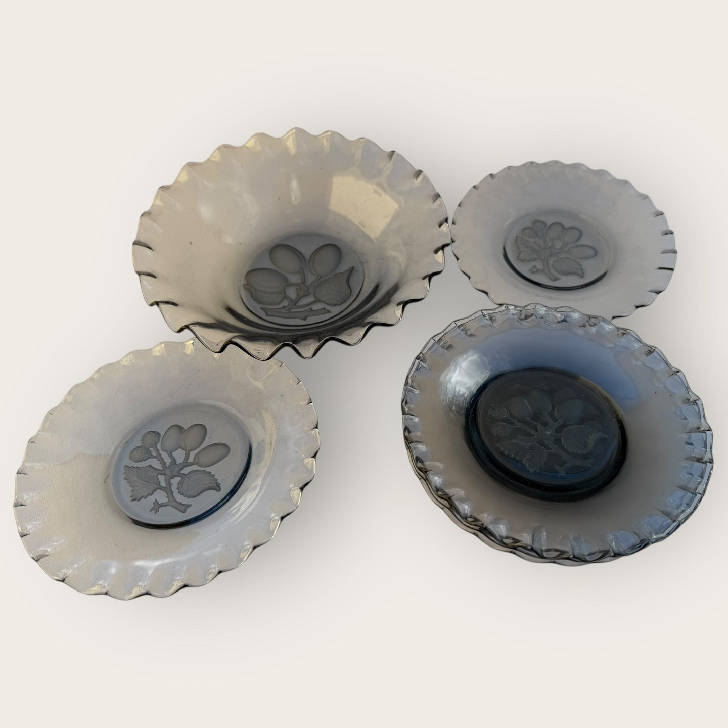 Glasschale und 6 Dessertteller mit Blumen-/Obstmotiv, gerüschter Rand aus grau getöntem Glas, Schalendurchmesser 21cm, Höhe 5,5cm, Tellerdurchmesser 16,5cm, *guter Zustand*Lager: 1
