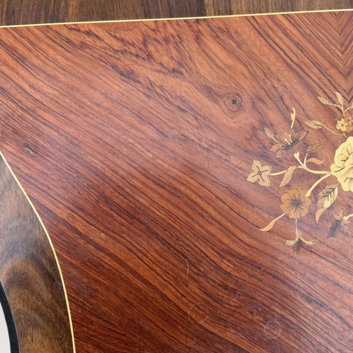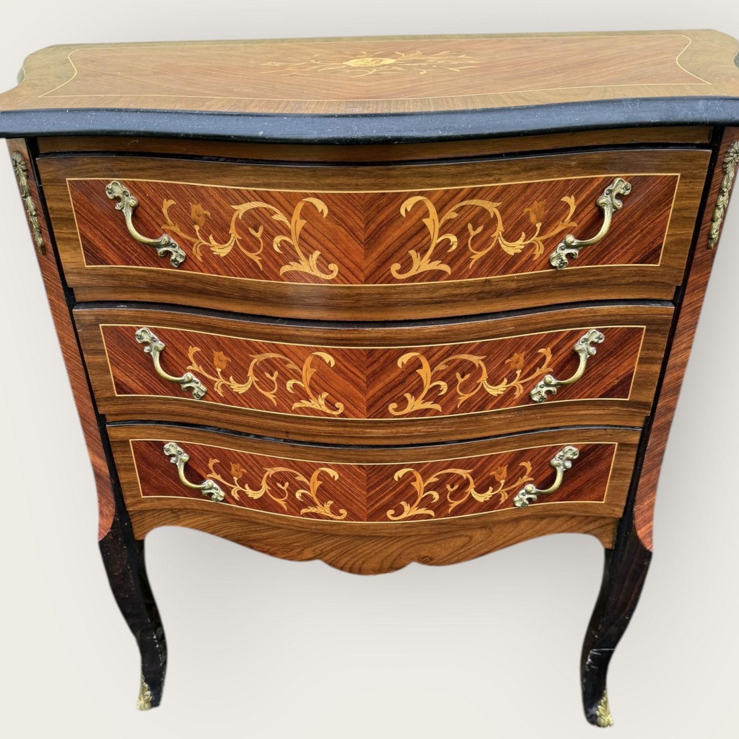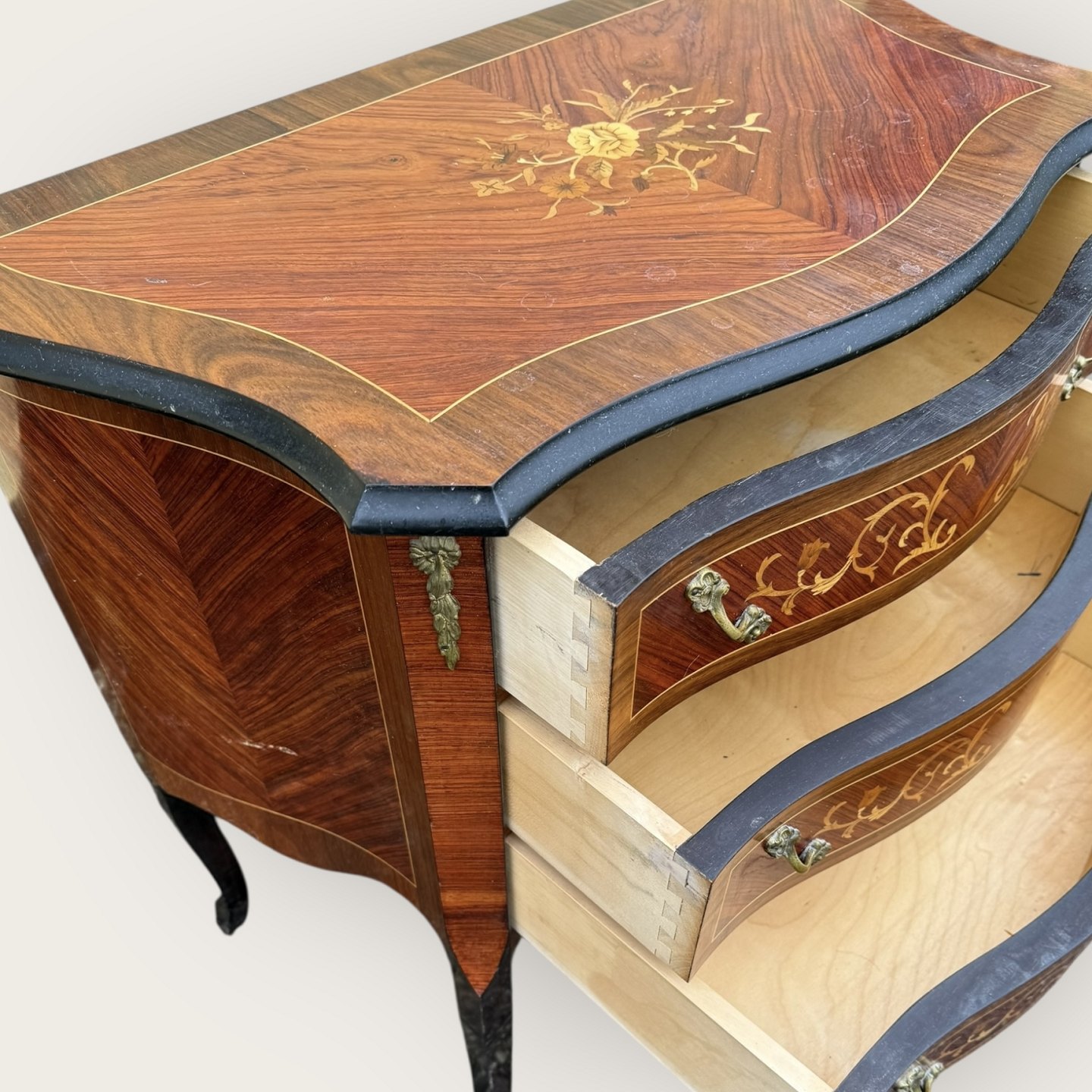 Kommode mit Intarsien, 3 Schubladen, einige Gebrauchsspuren, Maße: HxBxT 68x70x39cm