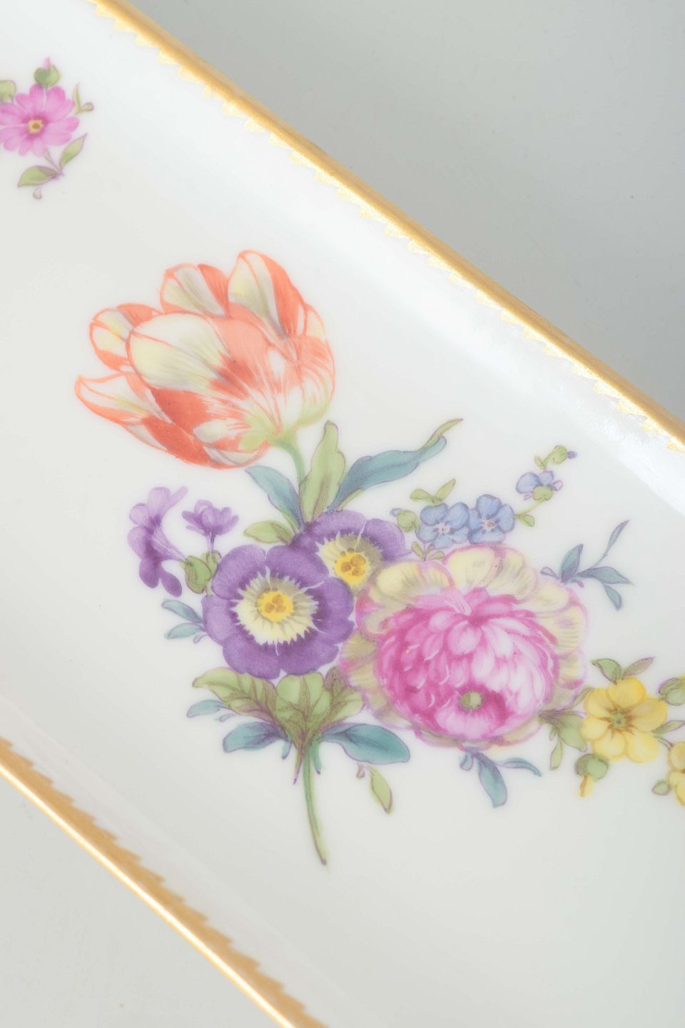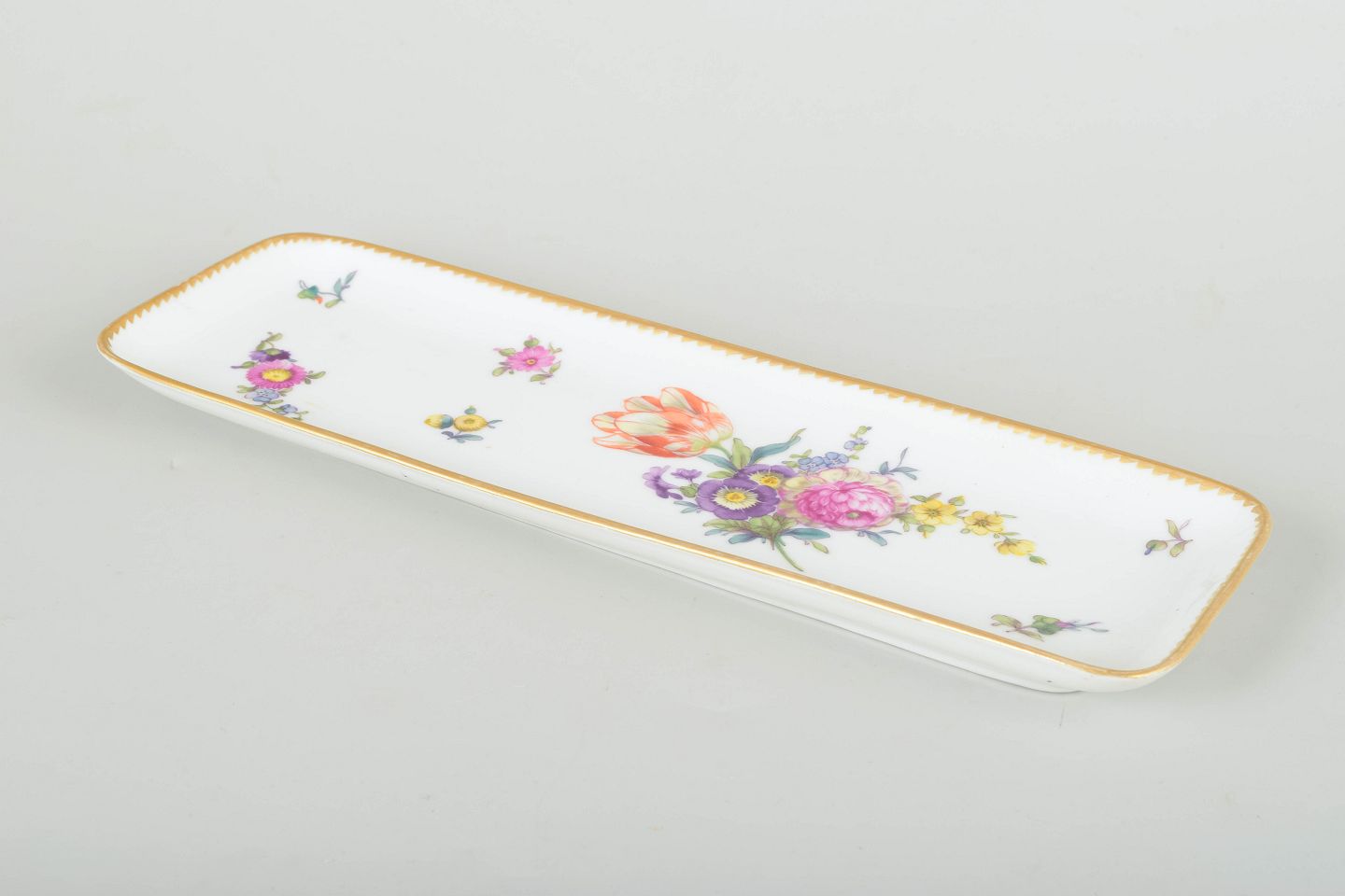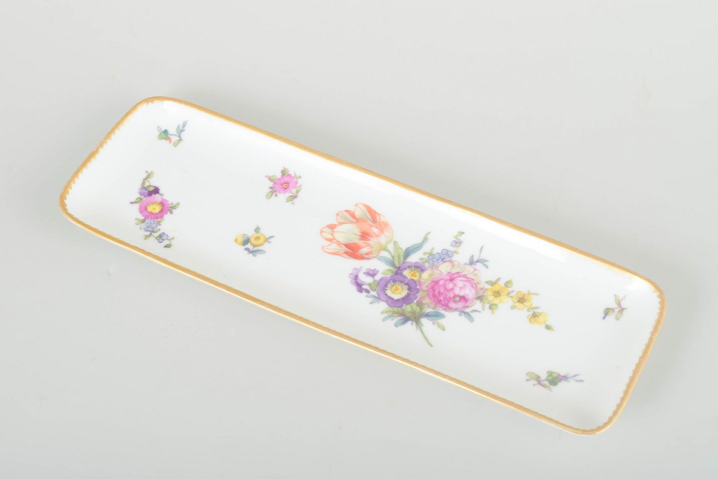 Antik rektangulær pennebakke i porcelæn, dekoreret med håndmalede blomster i det klassiske “Sachsisk Blomst” mønster og guldkant.