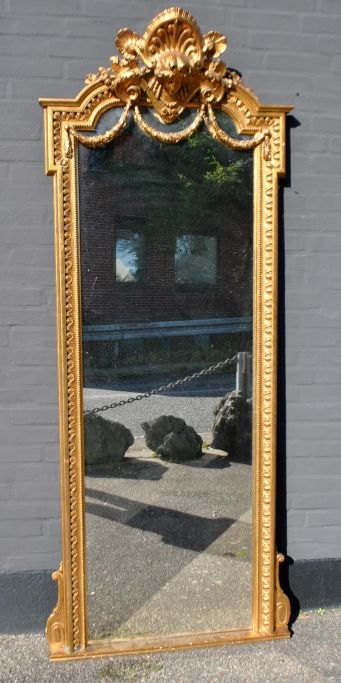 Großer dänischer antiker vergoldeter Spiegel, ca. 1870. Mit Randverzierungen. Oberseite mit Ranken und Frauengesicht. H.: 220 cm. B.: 85 cm.Bestellnummer: 28384