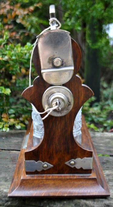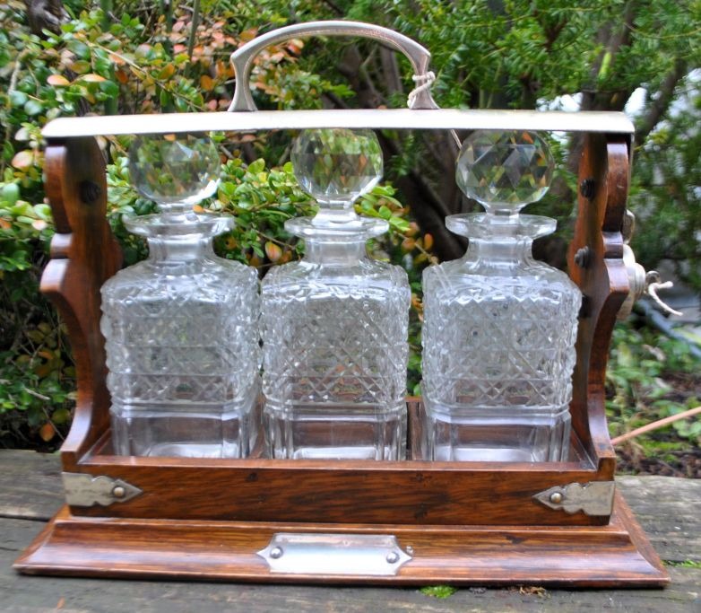 Tantalus af egetræ med tre karafler af krystal med propper. England. 19. årh.