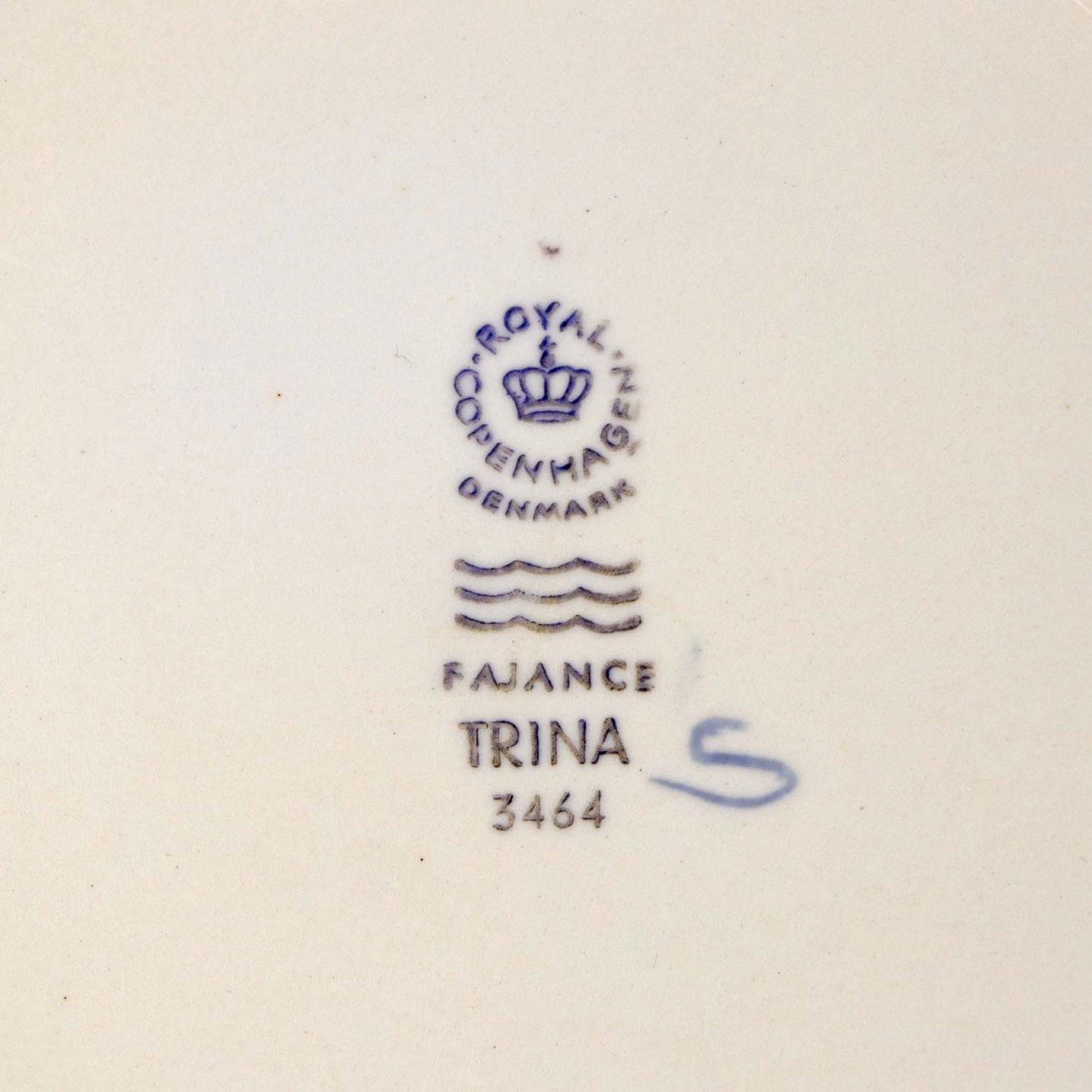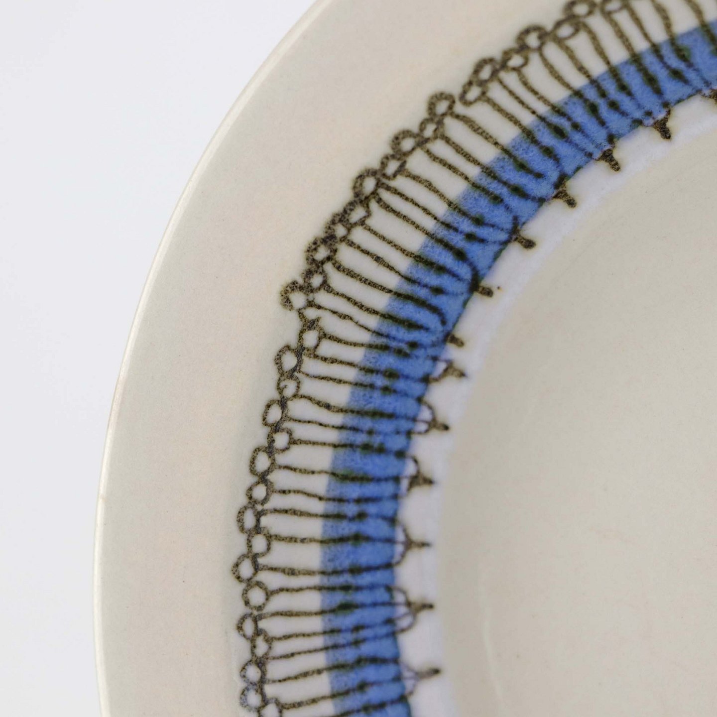 Service i lys fajance dekoreret med abstrakt mønster i sort streg over blå bort.