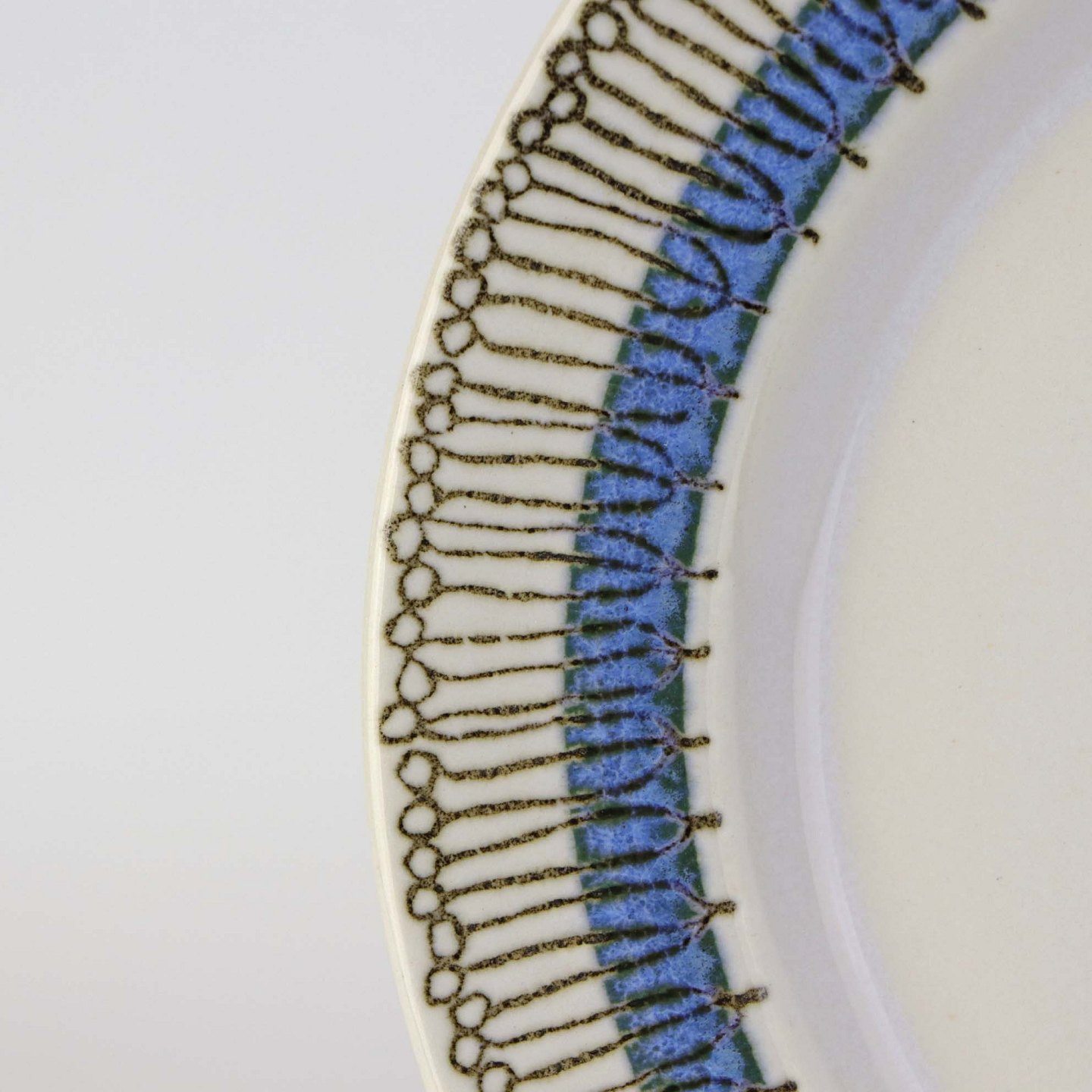 Service i lys fajance dekoreret med abstrakt mønster i sort streg over blå bort.