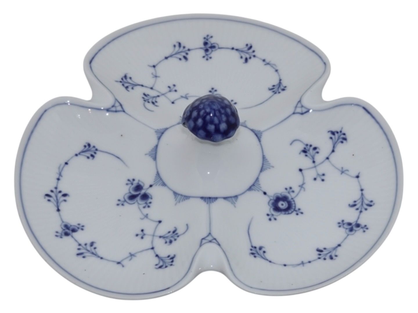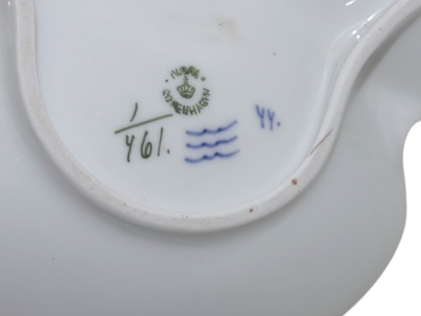 Der er lidt små sorte pletter i glasuren samt en medfødt brændingsfejl på undersiden ved siden af fabriksmærket, se sidste foto. Ellers fin stand.
