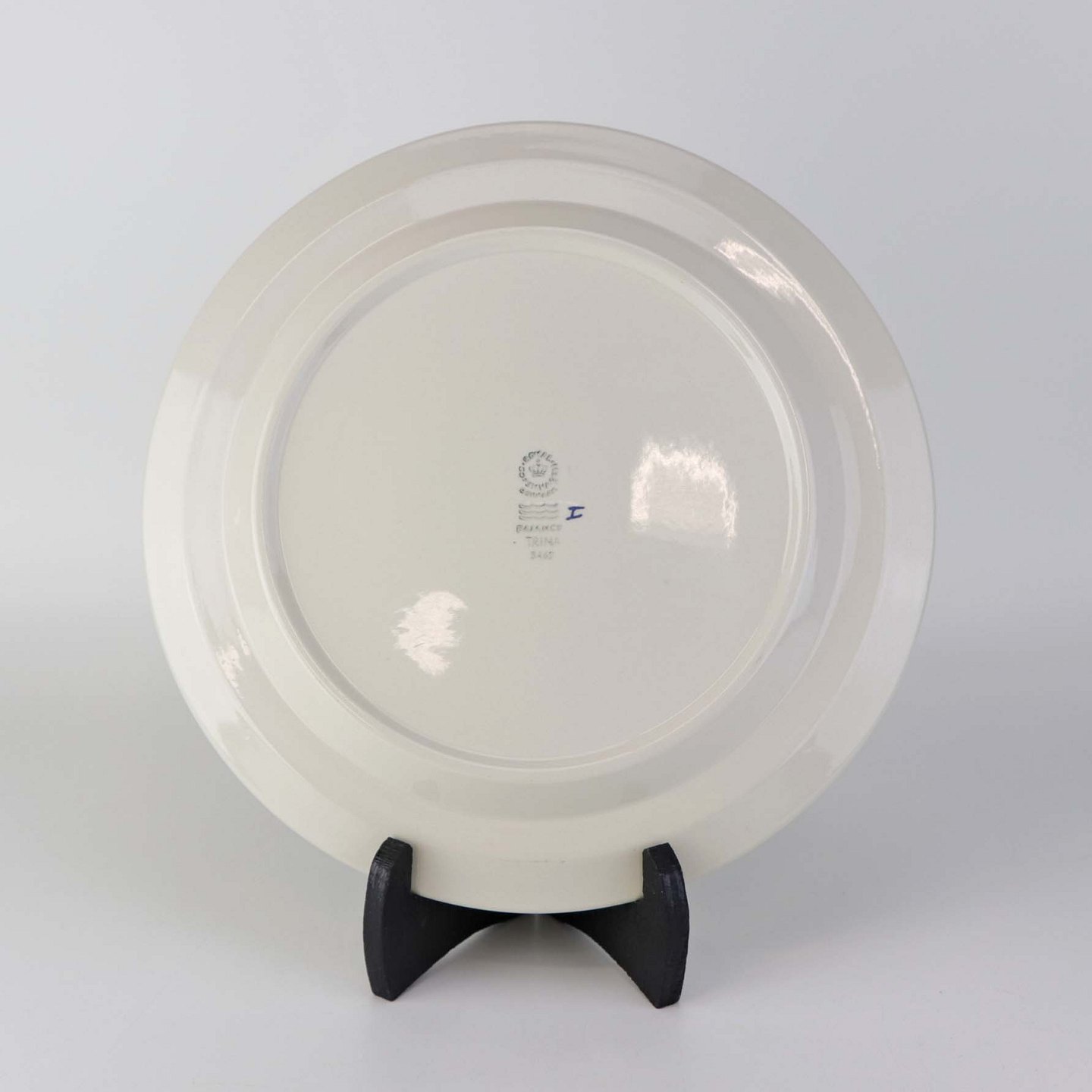 Service i lys fajance dekoreret med abstrakt mønster i sort streg over grøn bort.