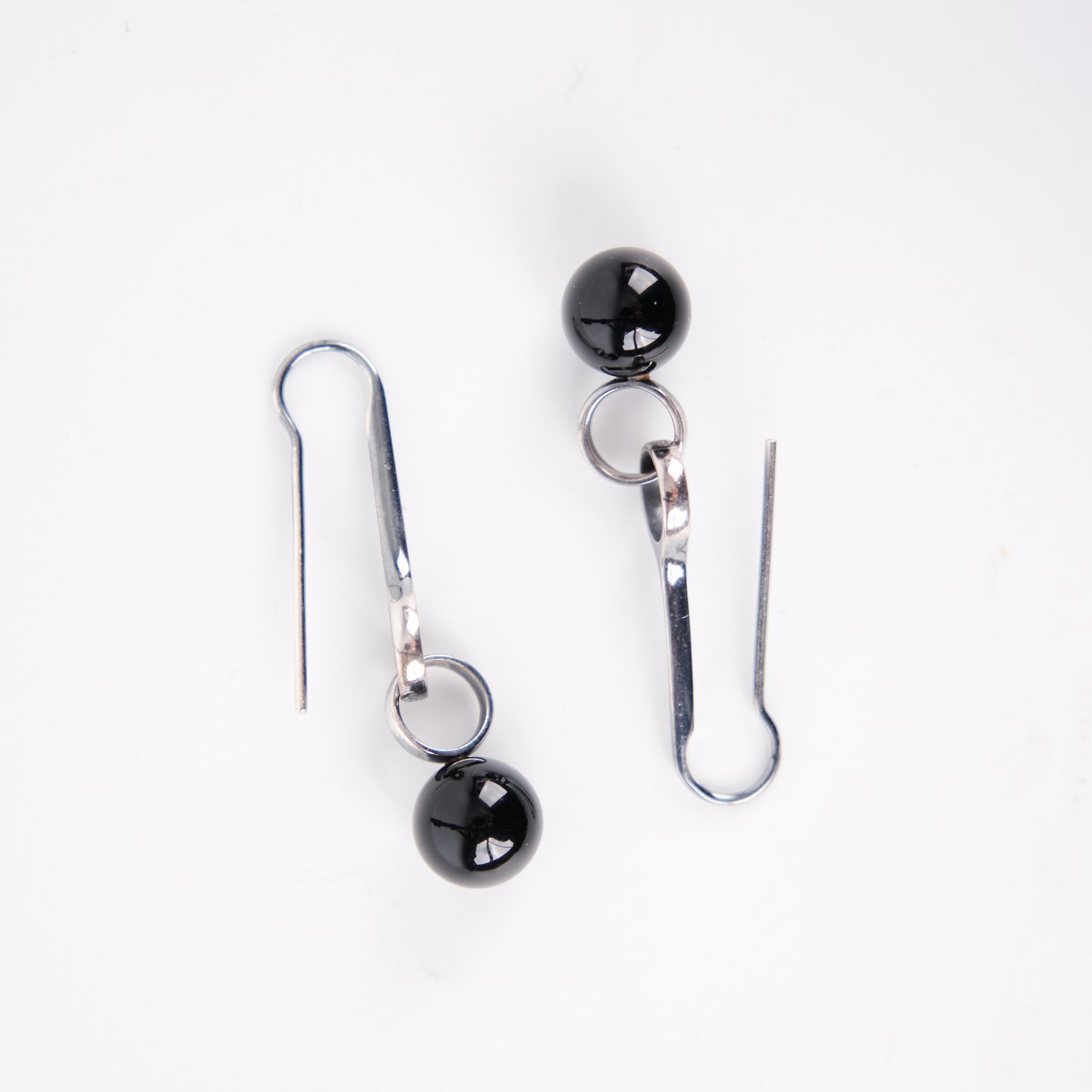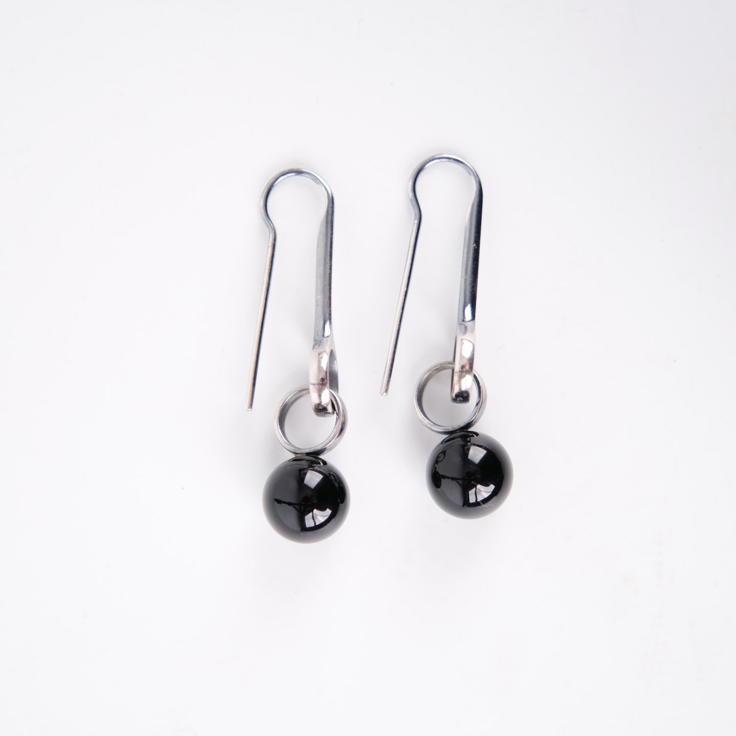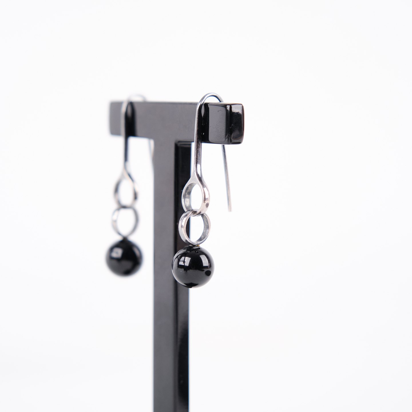 Ohrhänger aus Sterling Silber, gestempelt GJ 925S, entworfen von Regitze Overgaard für Georg Jensen. Elegante Kugel-Ohrringe mit schwarzem Achat, Modell 473A. Klassisches Schmuckdesign mit klaren Linien und hochwertigen Materialien.— Designerin: Regitze Overgaard