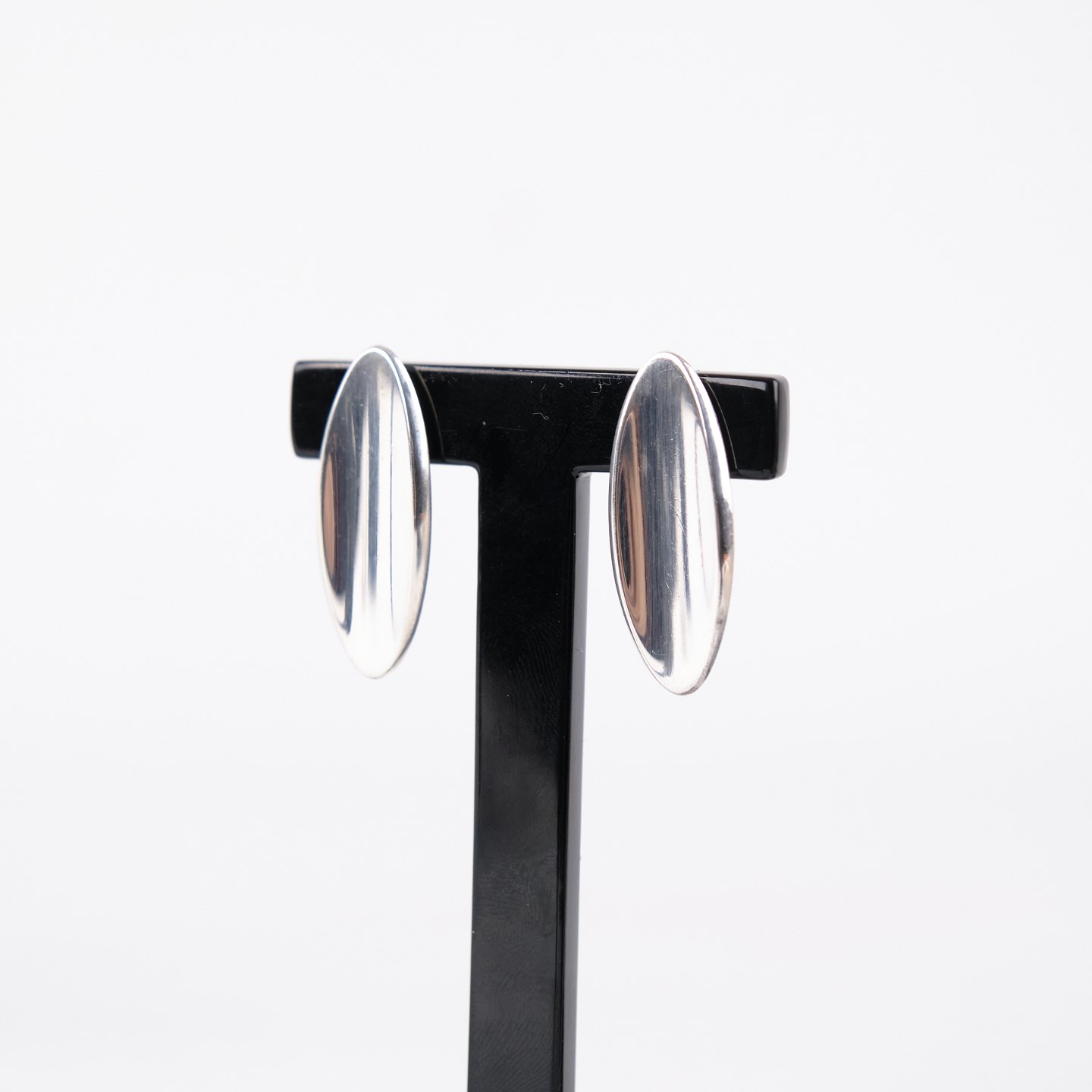 Oval stud earrings in sterling silver, model no. 427, designed by Hans Hansen. Elegant and timeless Danish jewelry design with the clean organic shape characteristic of the maker. A classic pair of solid silver earrings.— Designer/Manufacturer: Hans Hansen