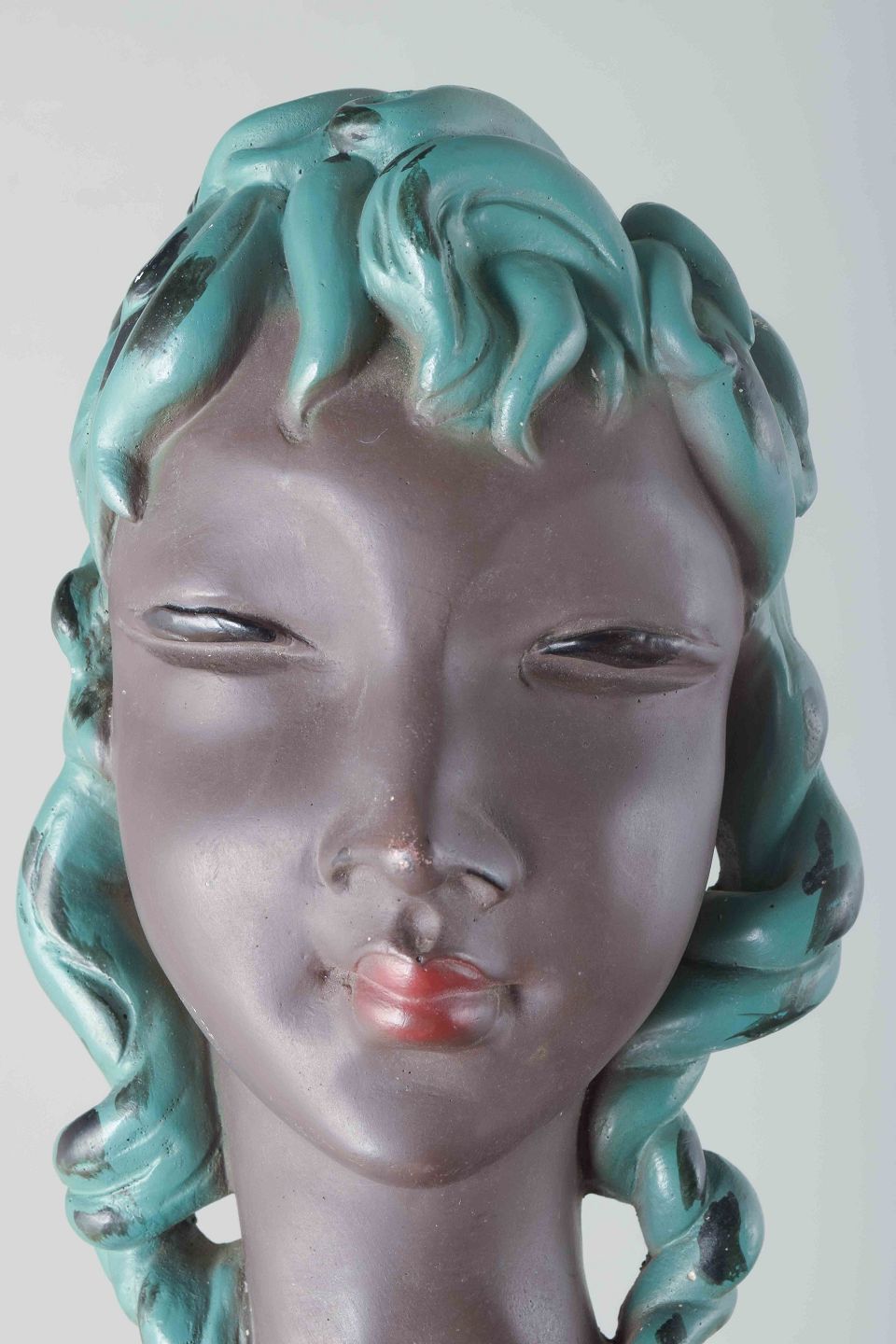 Dekorativ italiensk keramikbuste af kvindehoved med turkise og sorte hårtoner samt rødlig bluse. Udført i et karakteristisk stiliseret formsprog for perioden.