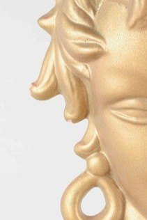 Dekorativt vægrelief i terrakotta, formet som et stiliseret kvindehoved med store øjne, bølget hår og ringformet ørering. Overfladen er bemalet med gylden dekor. Signeret.