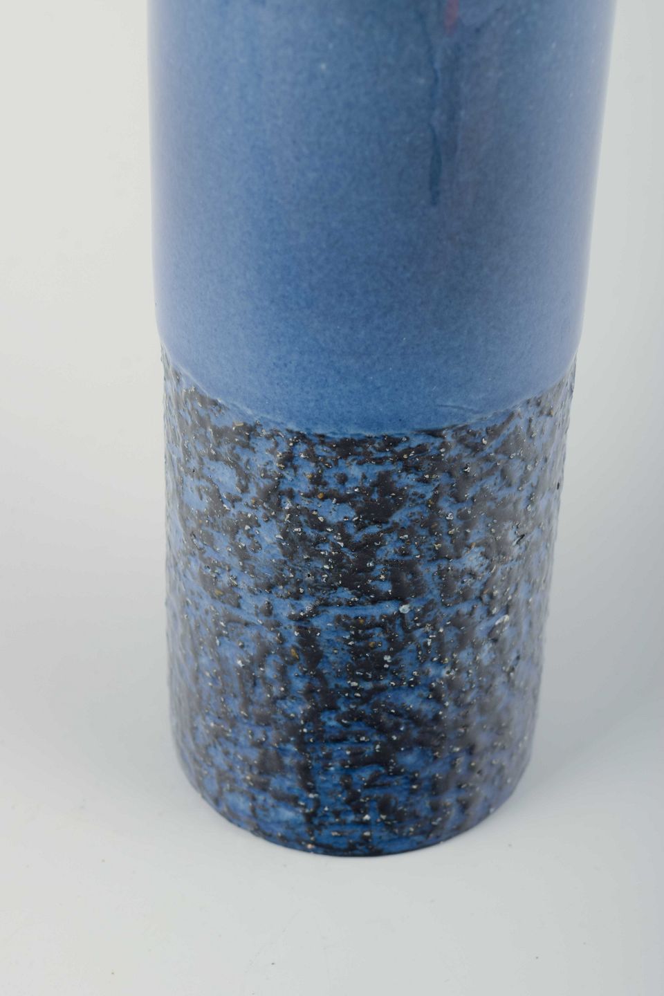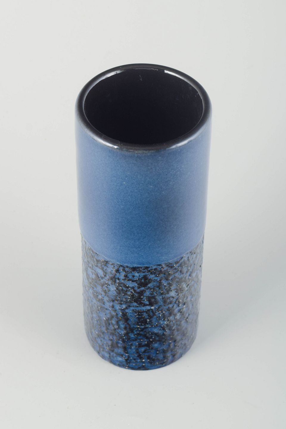 Cylindrisk vase i stentøj med todelt glasur – øverste halvdel i blank mellemblå tone og nederste del med mørkere, krystallinsk struktur i blå og sorte nuancer.