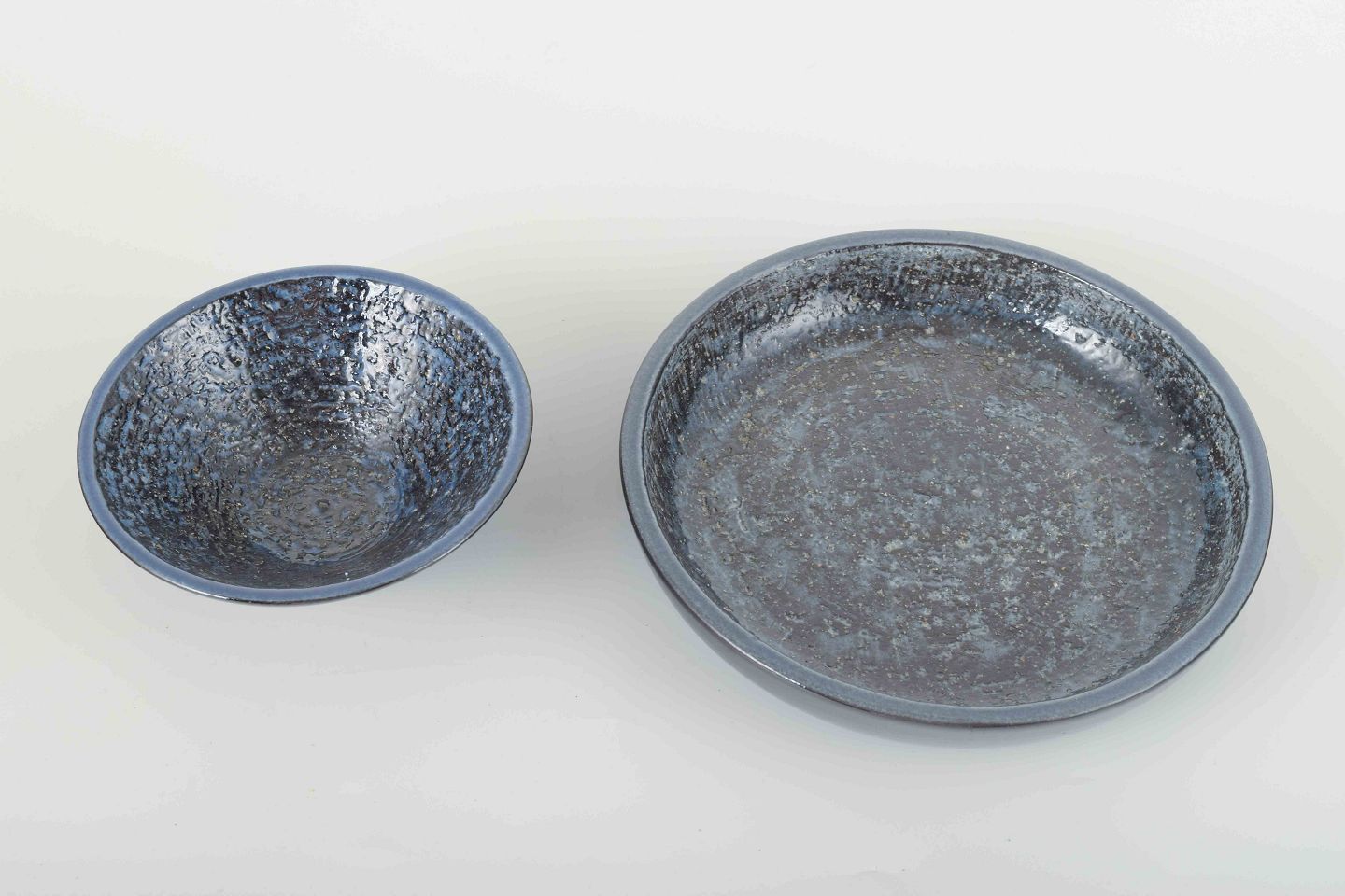 To konisk formede skåle i stentøj med dyb, mørkeblå glasur med let krystallinsk struktur.