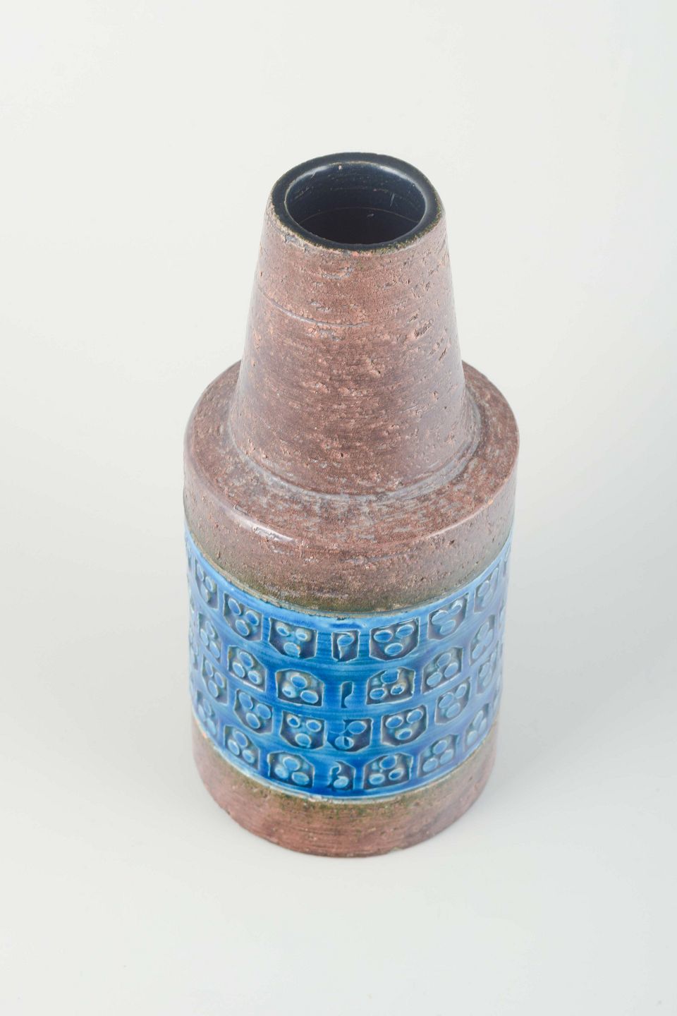 Cylindrisk vase i stentøj med rustik brun glasur og dekorativt bånd i den karakteristiske “Rimini Blu”-glasur med geometrisk reliefmønster i blå, turkis og grønne nuancer.