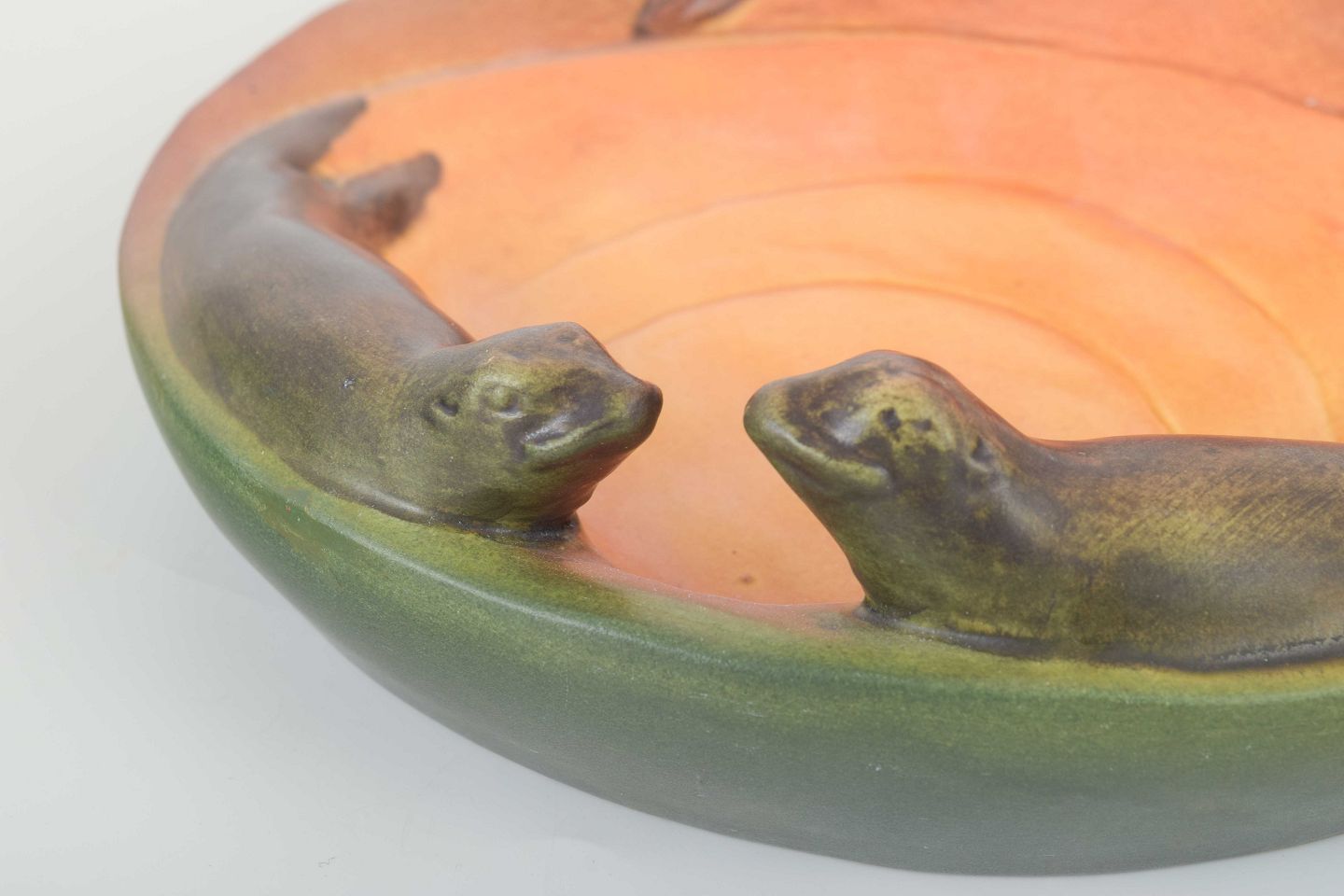 Dekorativ skål i form af tre sæler – to liggende og én siddende på kanten. Glasur i grønne og brunlige nuancer med naturlig overfladestruktur. Et klassisk figurativt arbejde fra Ipsens Enke, 1920’erne.