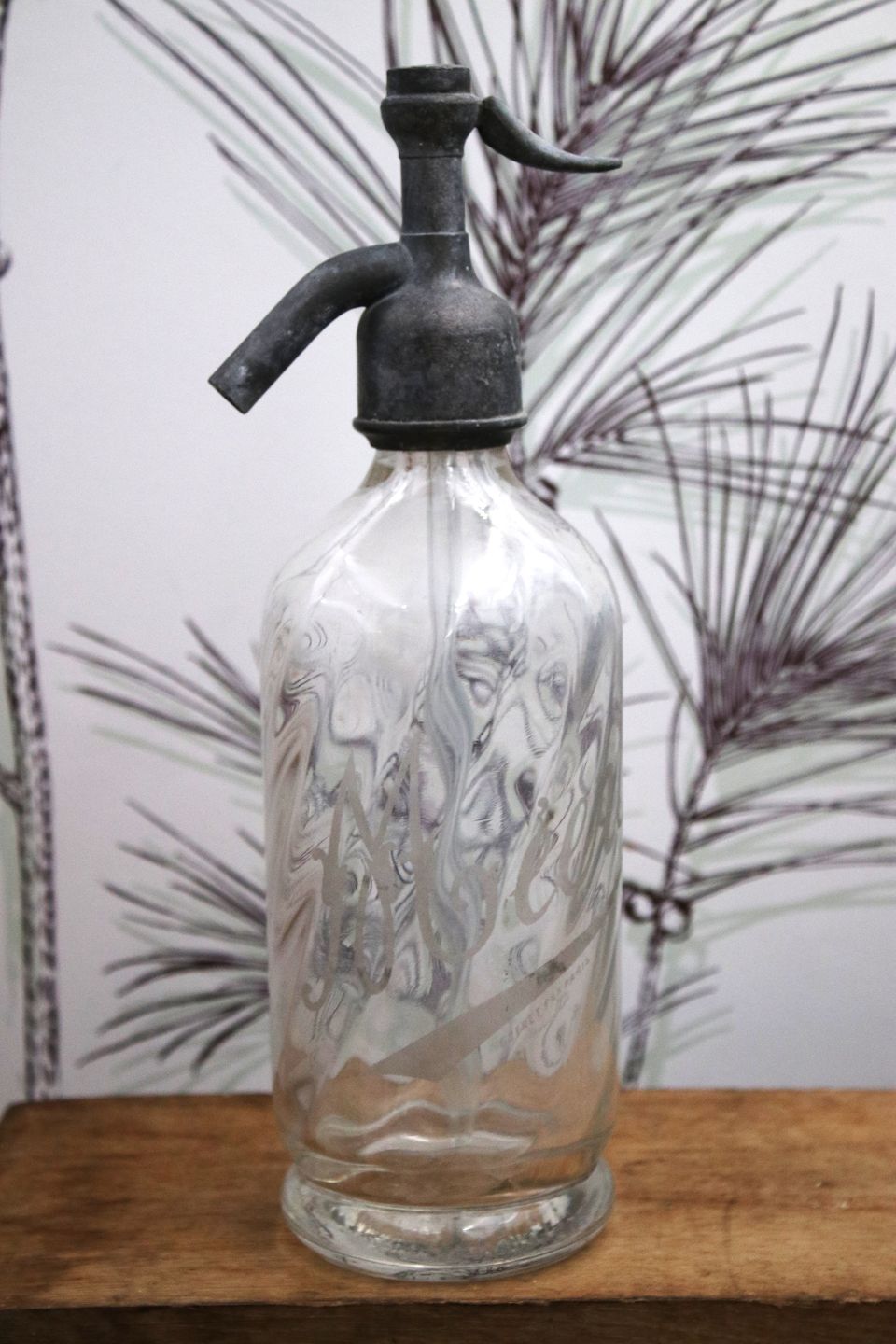 Dekorativ , sjælden fransk mini glas sifon fra begyndelsen af 1900 tallet i klart glas med graveret skrift på siden af sifonen og en fin patina.Sifonen stammer fra en gammel café. Højde:27cm.
