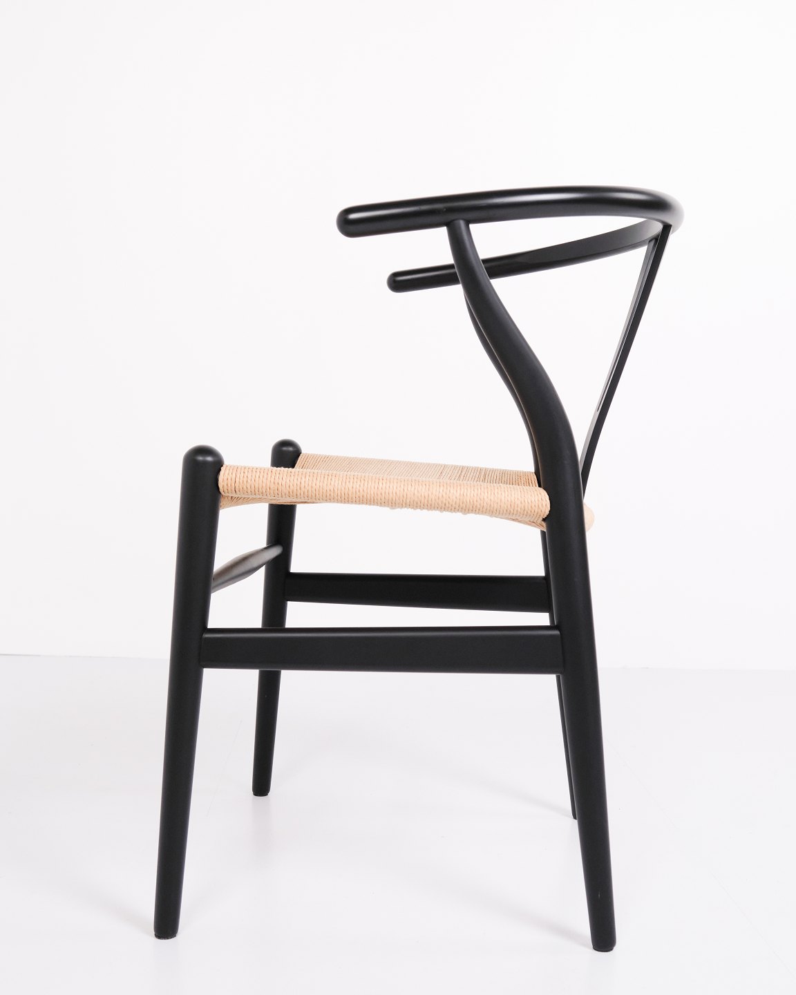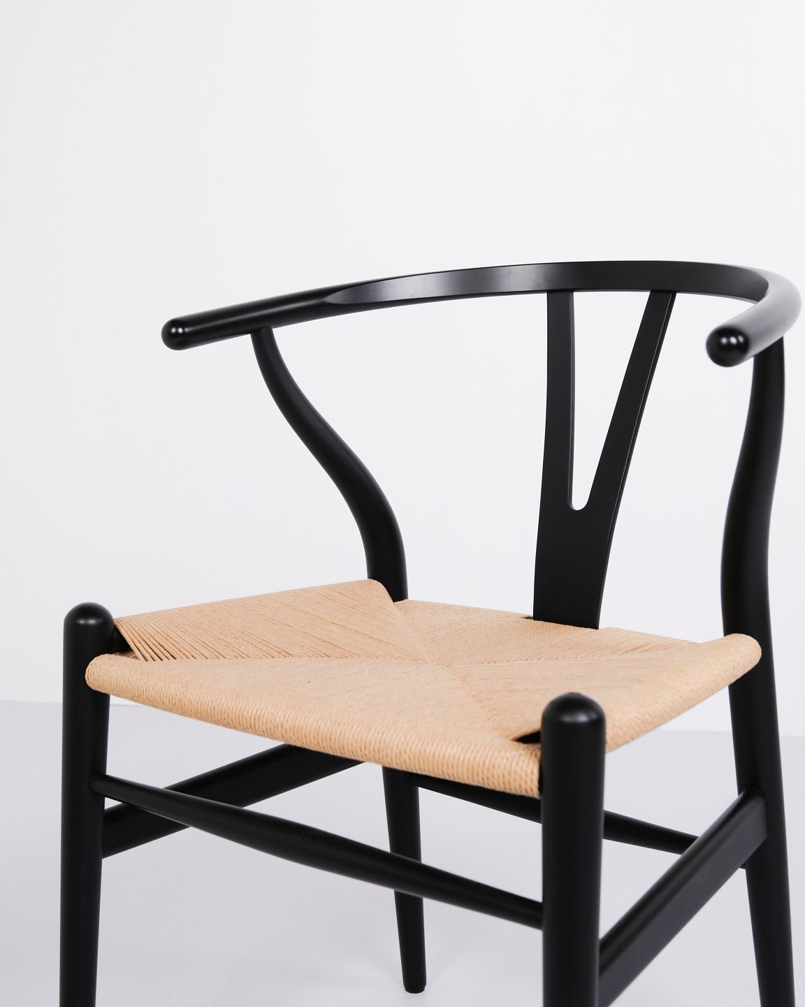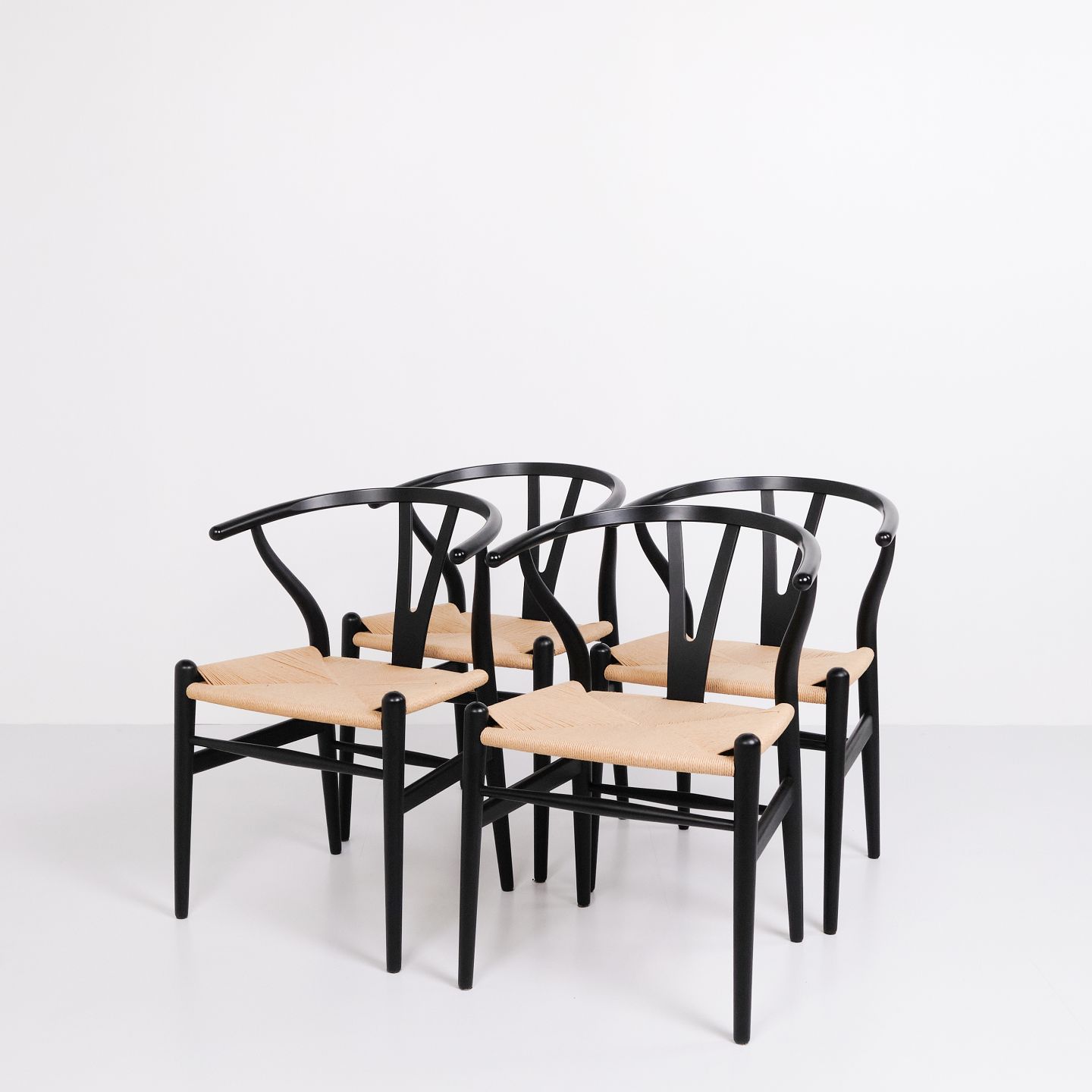 Sæt af fire Y-stole, model CH24, designet af Hans J. Wegner og produceret af Carl Hansen & Søn. Stolene er udført i massivt træ, lakeret i Soft Black, og med sæde i flettet naturpapir.— Designer: Hans J. Wegner
