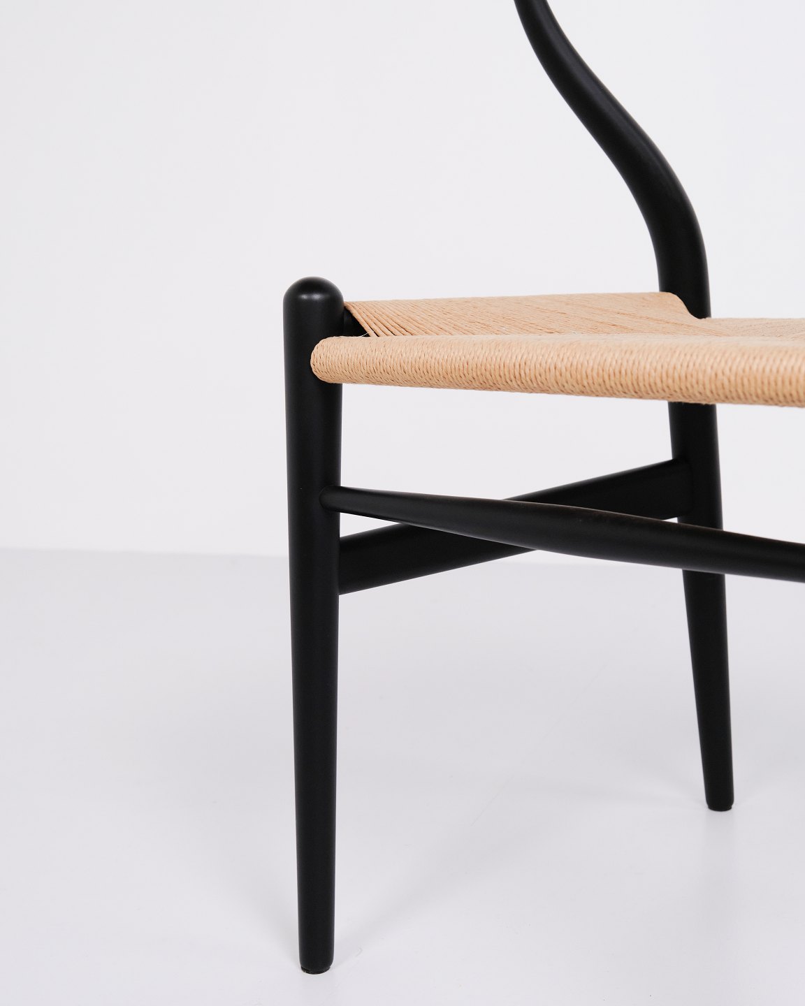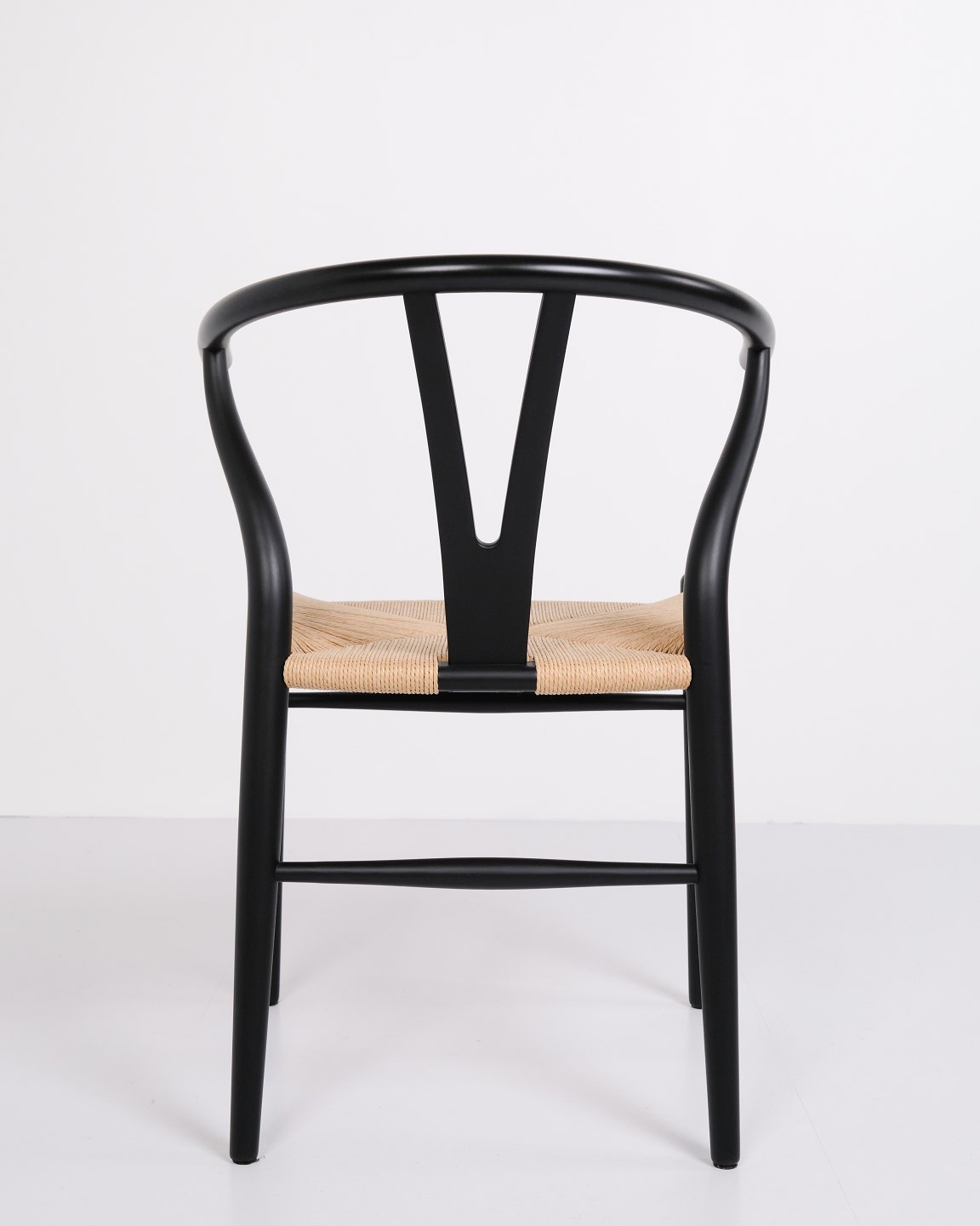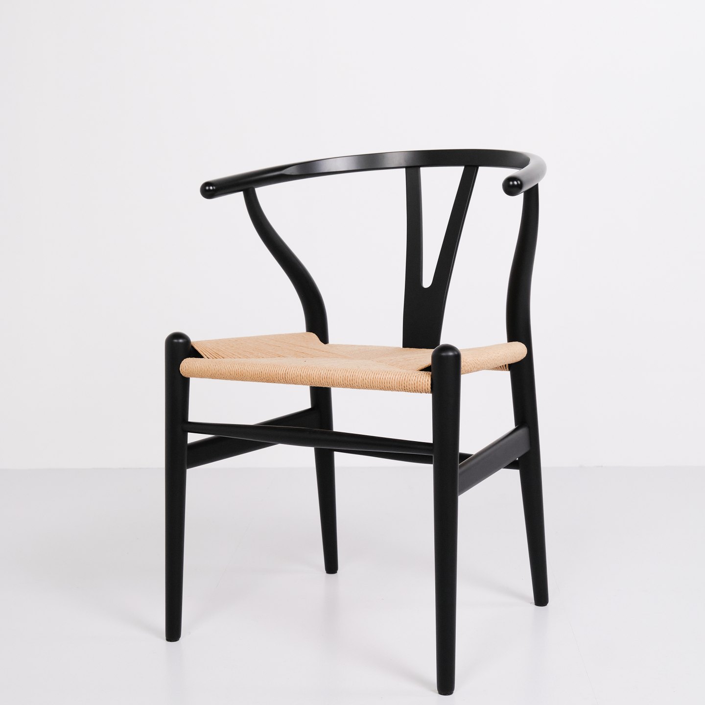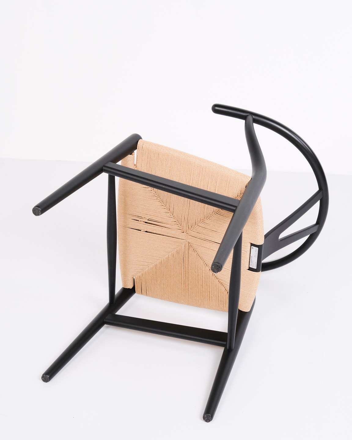 Sæt af fire Y-stole, model CH24, designet af Hans J. Wegner og produceret af Carl Hansen & Søn. Stolene er udført i massivt træ, lakeret i Soft Black, og med sæde i flettet naturpapir.— Designer: Hans J. Wegner