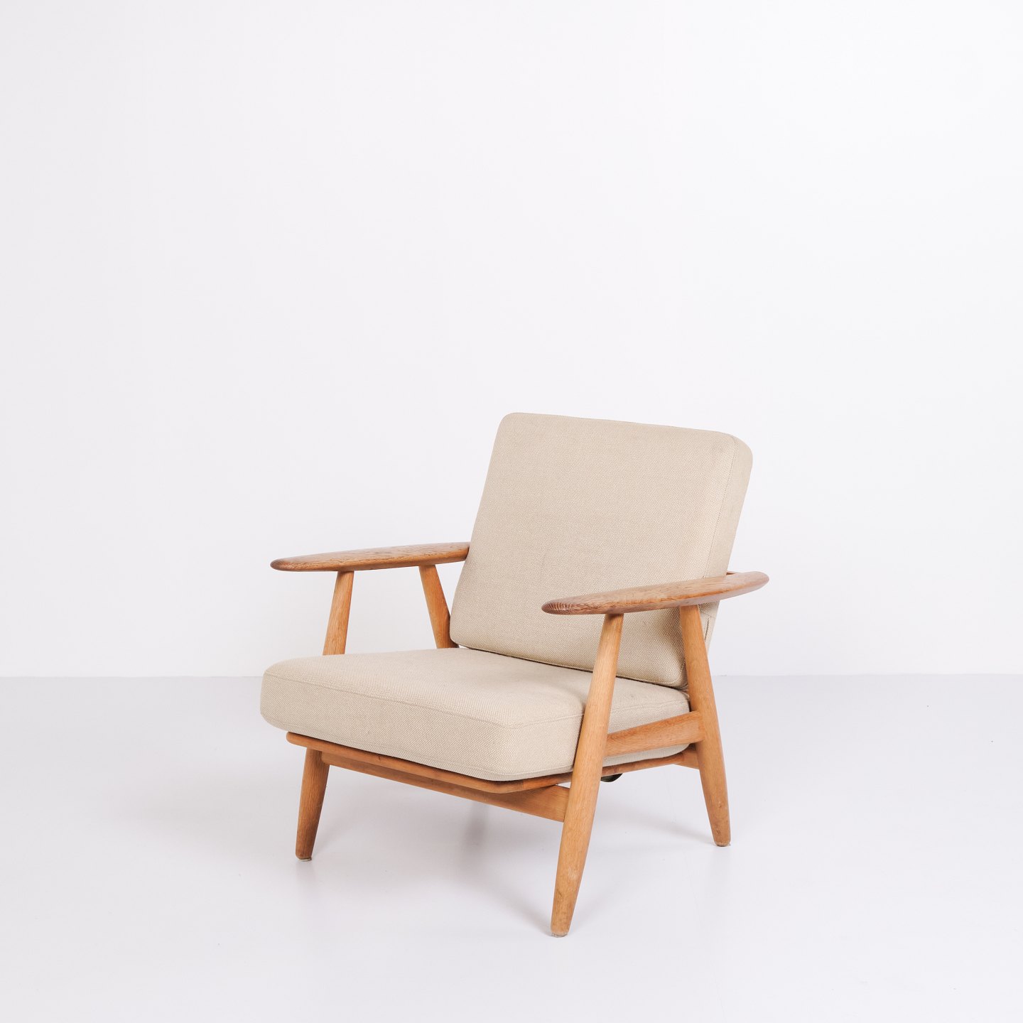 Sæt af to originale “Cigar” lænestole, model GE 240, designet af Hans J. Wegner og fremstillet af Getama i 1960’erne. Stolene er udført i massiv eg med polstring i lyst stof.— Oprindelse: Danmark