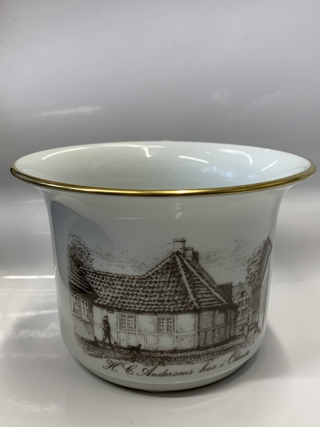 Bing & Grøndahl H.C. Andersen urtepotteskjuler med guldkant.Motiv: H.C. Andersens hus i odense på den ene side og på den anden side H.C. Andersens Rejsekuffert.