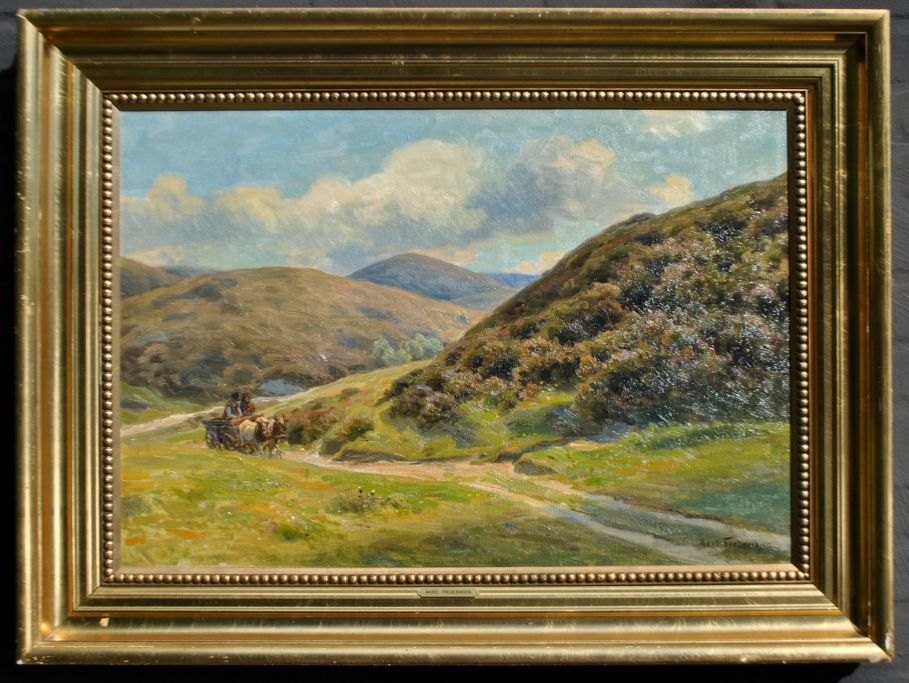 Frederiksen, Axel (1881 - 1961) Dänemark: Ein Ochsenkarren in Rebild Bakker. Öl auf Leinwand. Unterzeichnet. 50 x 70 cm.Gerahmt: 65 x 88 cm.