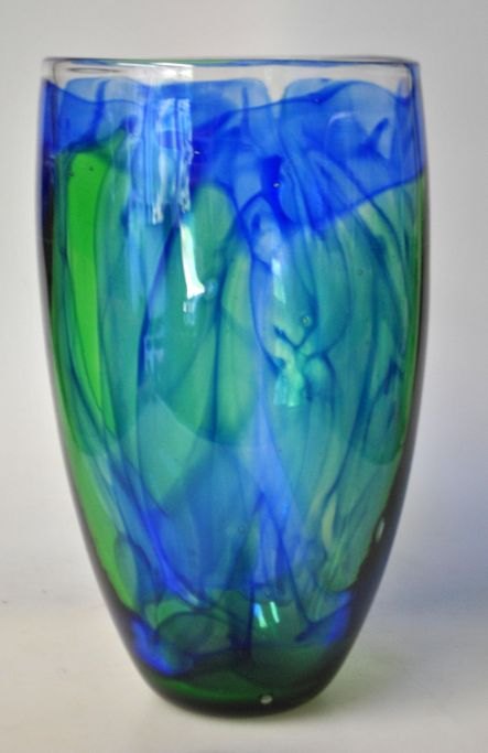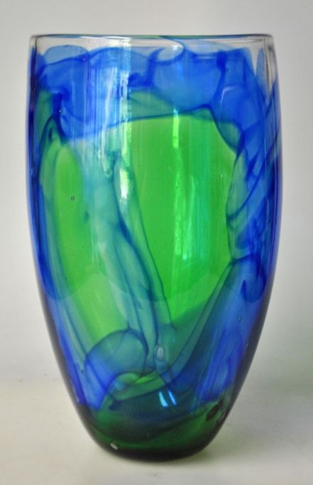 Dänischer Künstler (20. Jahrhundert): Glasvase in Blau und Grün. H: 21 cm. Durchmesser: 12 cm.Bestellnummer: 28221