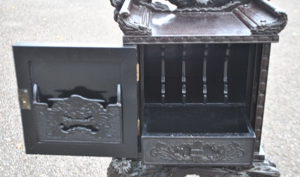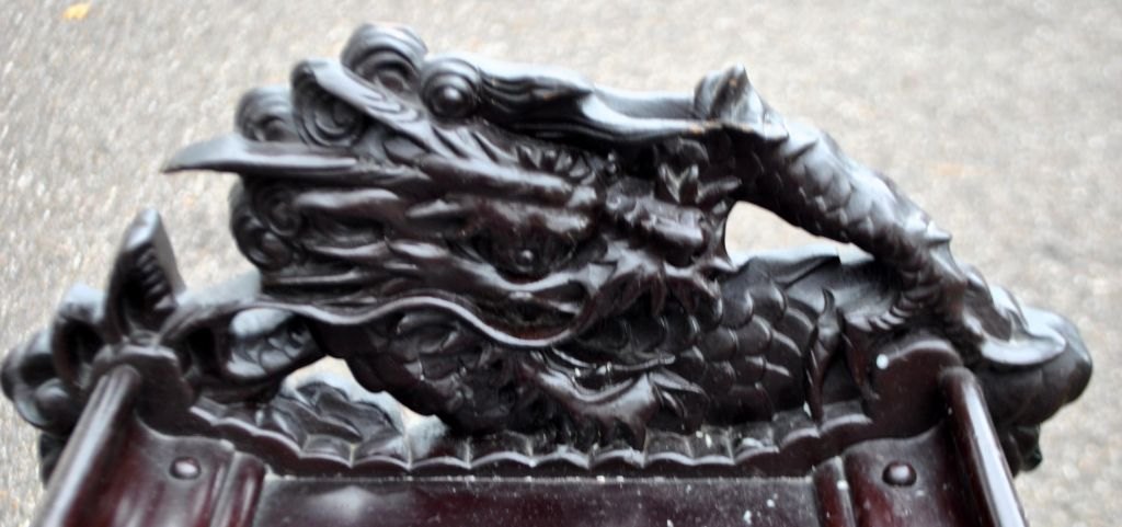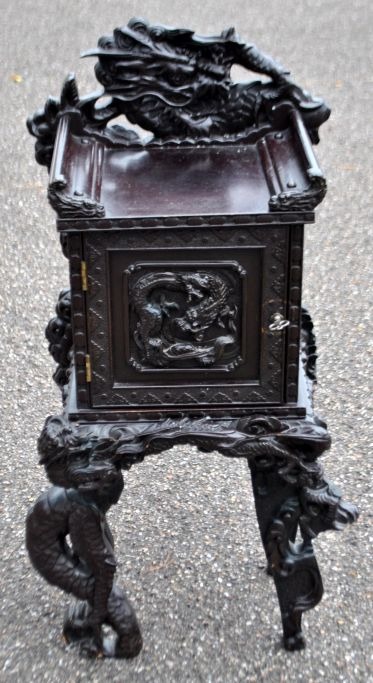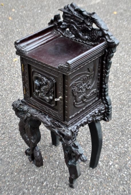 Kleiner chinesischer Briefschrank aus Hartholz, 20. Jahrhundert. Dunkles Holz mit vielen geschnitzten Drachen. Innen Briefablage und Schublade. H: 73 cm. B: 39 cm. T: 28 cm.Bestellnummer: 28234