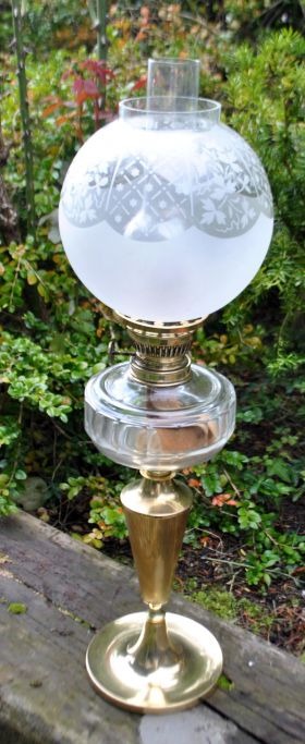 Petroleumlampe, um 1880. Sockel aus Messing, Behälter aus klarem Glas mit Einschnitten und oberer Kuppel aus Milchglas mit Verzierungen. Höhe mit Brenner: 63 cm.Hervorragender Zustand – sieht frisch poliert aus.
