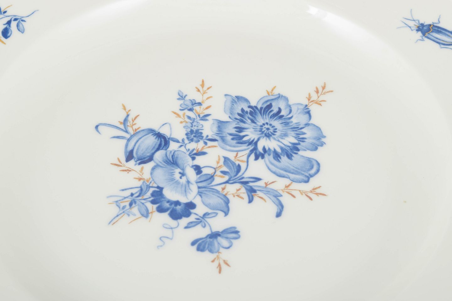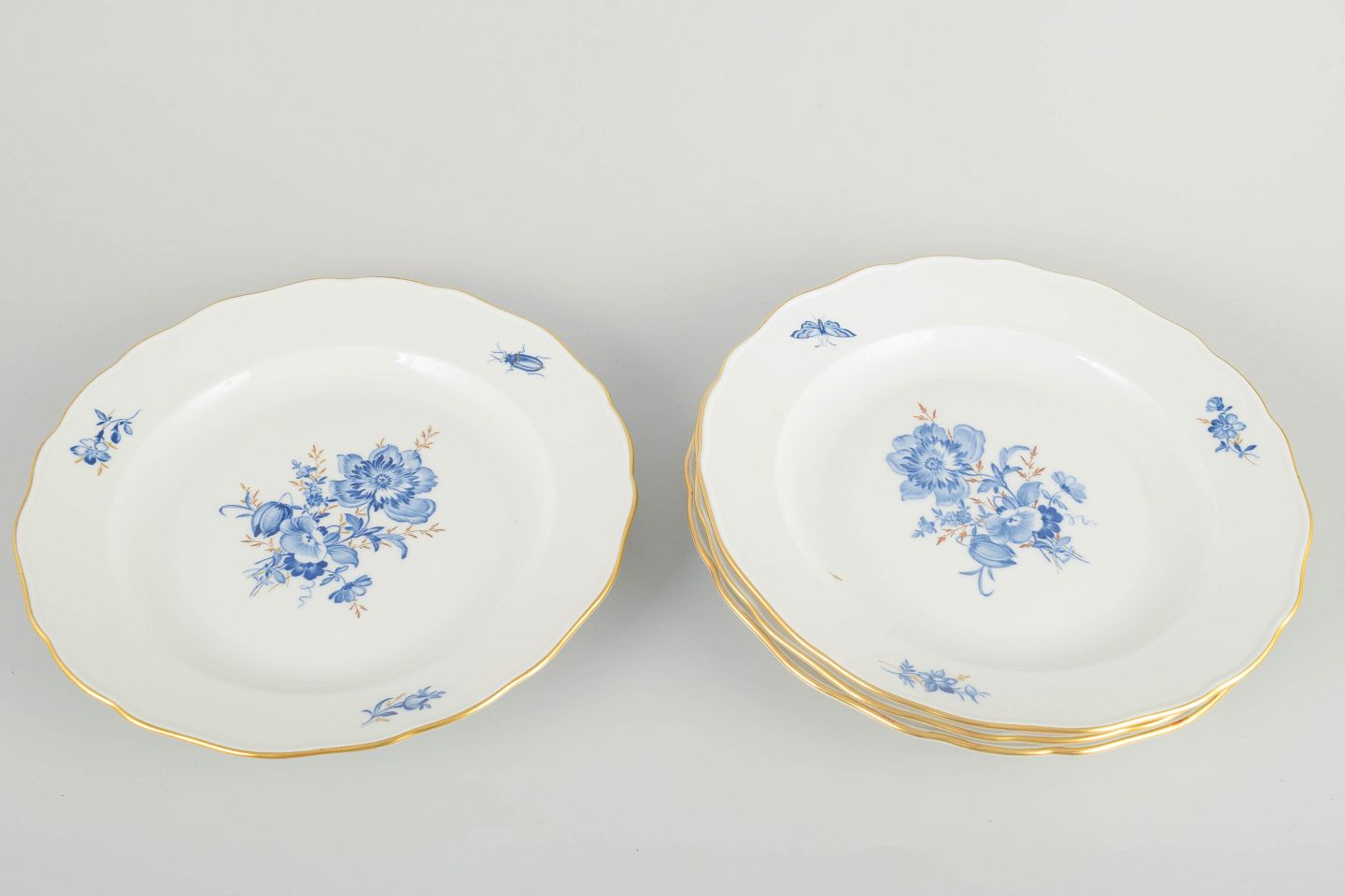 Hånddekoreret porcelæn med håndmalede blå blomsterdekorationer og forgyldte stafferinger langs kanten. Klassisk let bølget form.