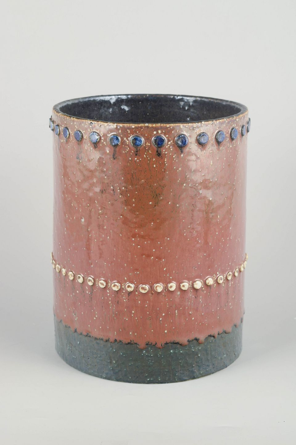 Cylinderformet hånddrejet stentøjsvase med rødbrun glasur, mørk indvendig glasur og dekorative bånd af applikerede blå og lyse keramiske knopper i relief.