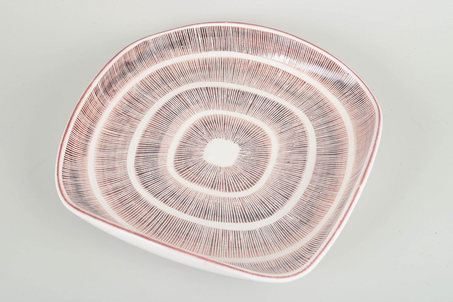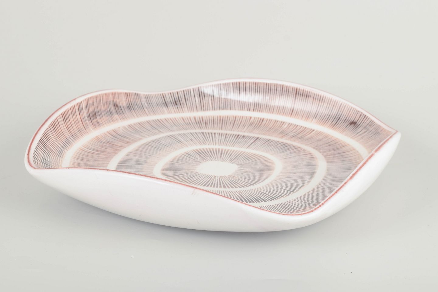 Organic-shaped serving dish in glazed stoneware with graphic radial decoration in reddish and white tones.
