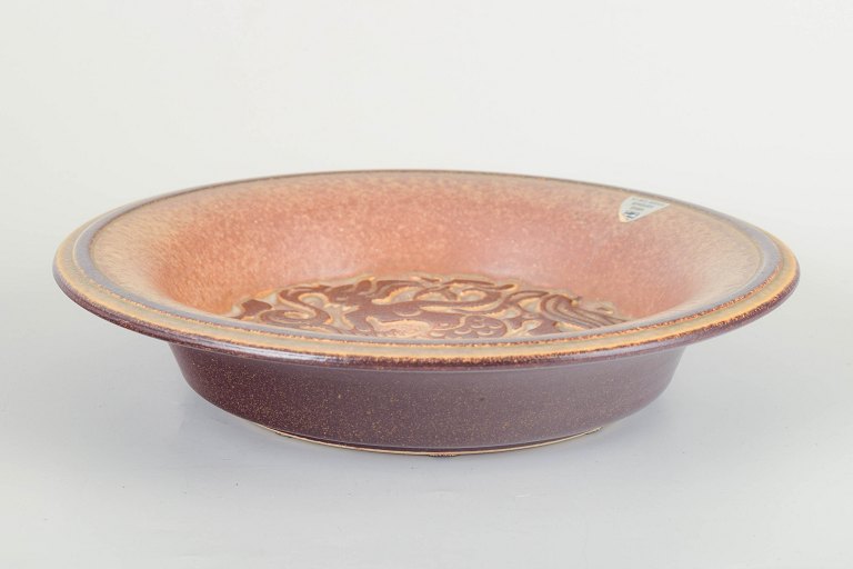 Rund stentøjsskål med reliefdekoreret centrum med stiliseret fisk og organiske bølgeformer. Model 6407/2.