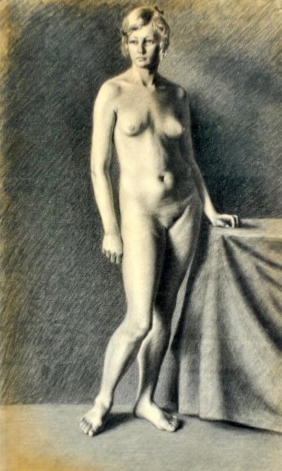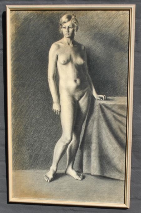 Dänischer Künstler 20. Jahrhundert: Ein junges weibliches Modell. Zeichnung auf Papier. Unsigniert. 80 x 49 cm.Gerahmt in einem silbernen Rahmen: 85 x 53 cm.