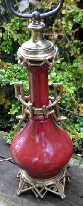 Französische Tischlampe, 19. Jahrhundert. Ehemalige Petroleumlampe, auf elektrisch umgerüstet. Bronze und Korpus aus ochsenblutfarbenem Porzellan. H.: 65 cm.Bestellnummer: 28444
