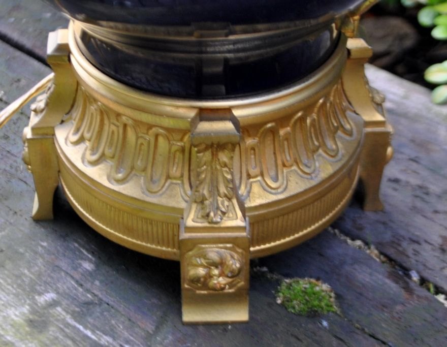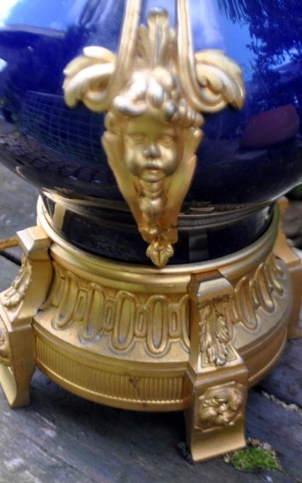 Französische Tischlampe, 19. Jahrhundert. Ehemalige Petroleumlampe, umgebaut auf elektrisch. Vergoldete Bronze, Korpus aus blauem Porzellan. Mit wunderschönen Engelsverzierungen. H.: 65 cm.Bestellnummer: 28445