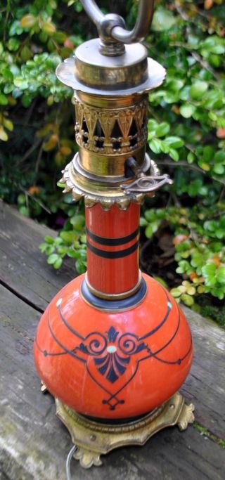 Französische Tischlampe, 19. Jahrhundert. Ehemalige Petroleumlampe, umgebaut auf elektrisch. Bronze und Korpus aus rotem Porzellan mit Verzierungen. H.: 59 cm.Bestellnummer: 28446