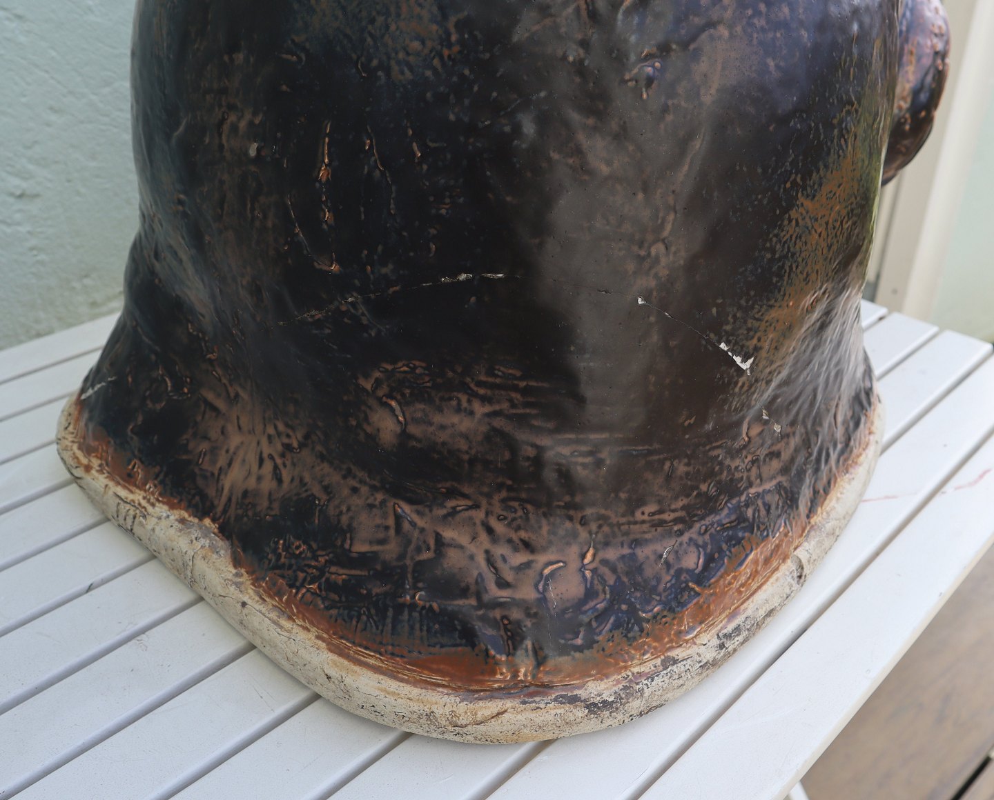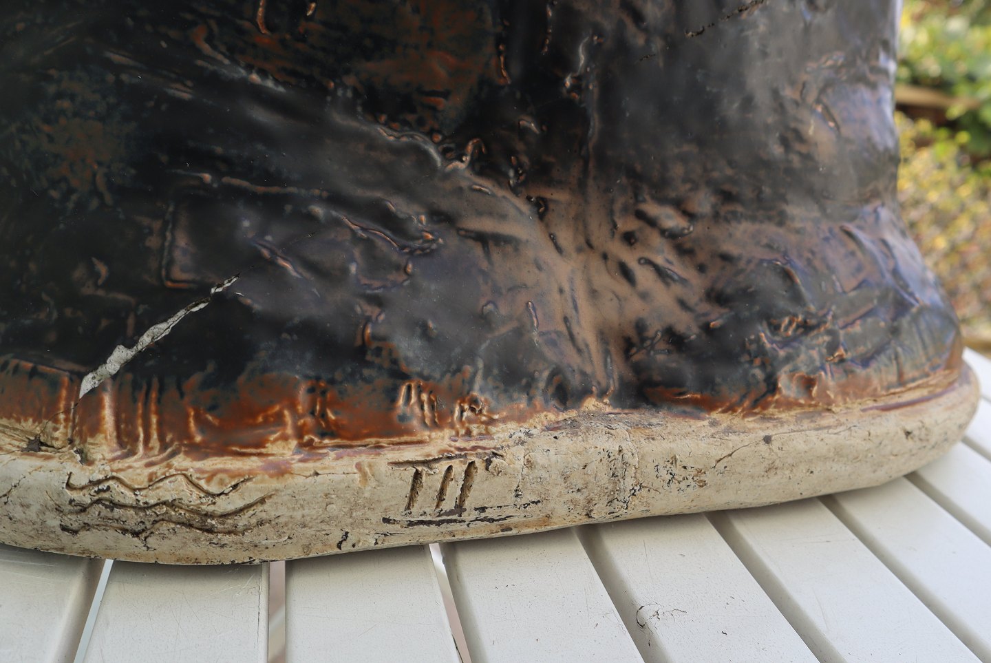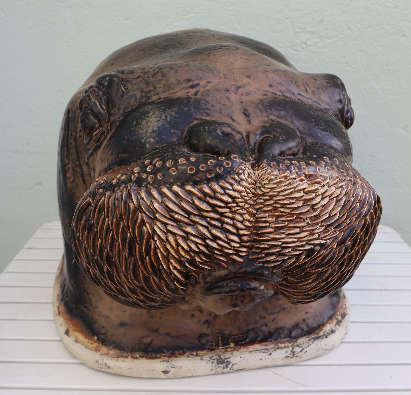 1 stk mulig prototype (No 3) i brun dilou glasur mærket med de tre bølgelinier 6 #III og synlige brændingsrevner/ sammenføjninger - flere billeder kan sendes - eller kom og se den i MariagerJeanne Grut Stentøj Gustav - Hvalros 40 x 46 x 42 cm