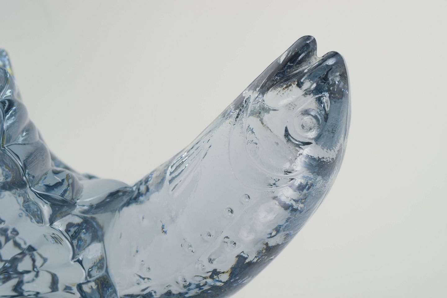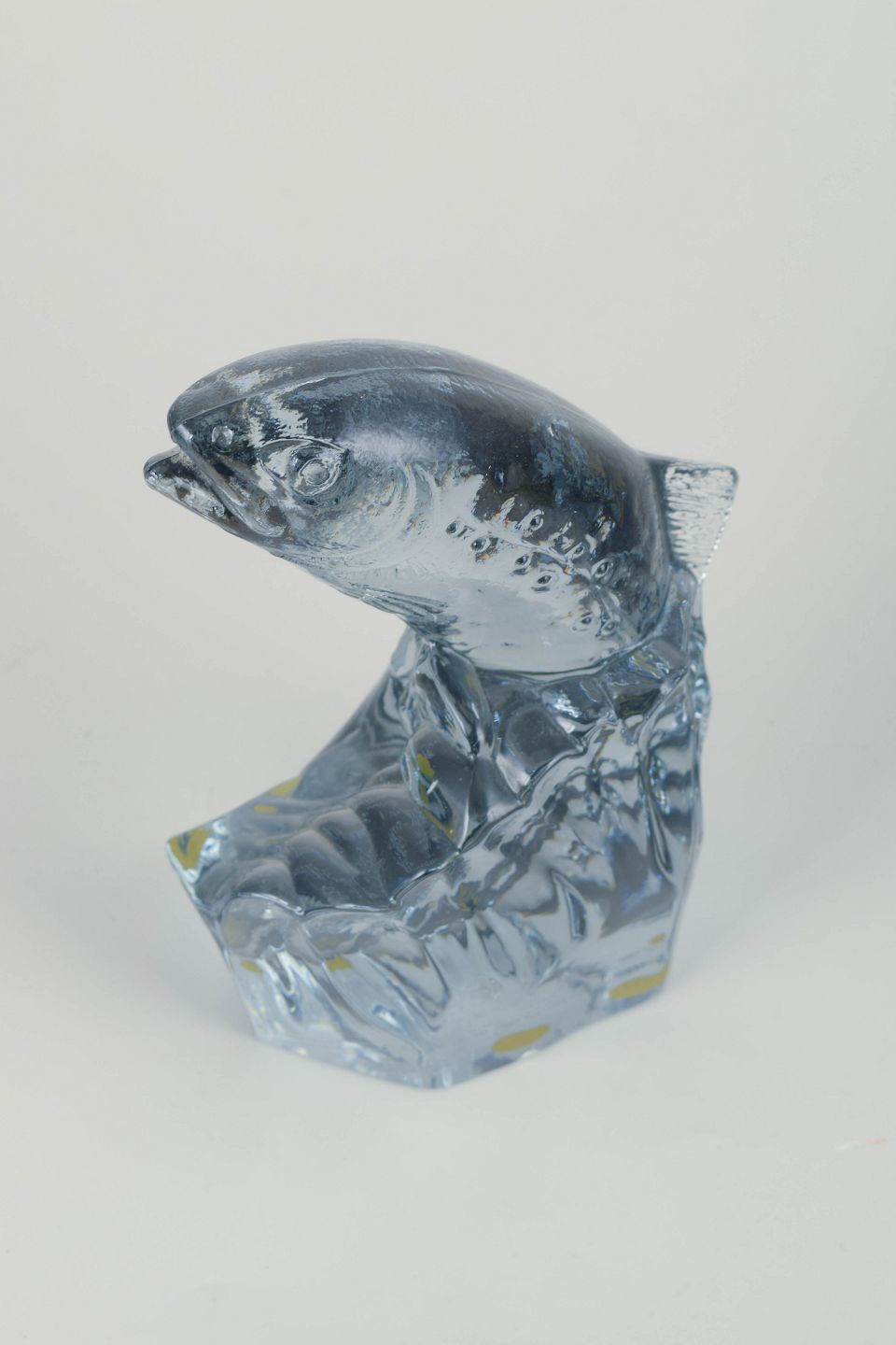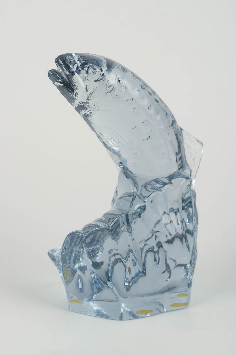 Håndstøbt kunstglasfigur af springende laks, udført i klart glas med detaljeret naturtro modellering, fremstillet i samarbejde med World Wildlife Fund. Skulpturel fremstilling af fisken i bevægelse mod vandstrømmen.