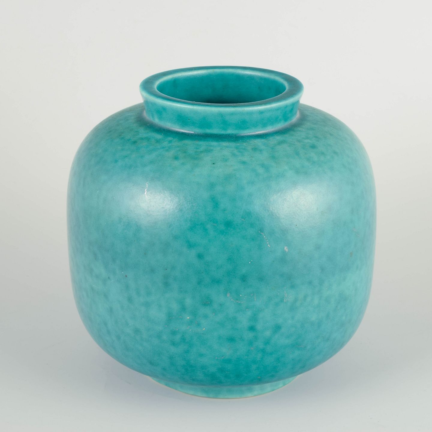 Ustemplet vase i blødt afrundet cylindrisk form med let indtrukket hals og dyb turkis glasur med levende farvespil – typisk for Kåges Azur/Tonan-serie. Elegant og harmonisk art deco-udtryk.