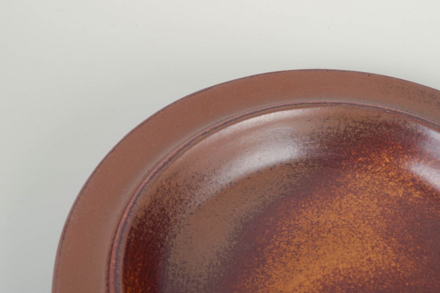 Blødt afrundet oval form dækket af varm brun Ruska-glasur med levende nuancer og karakteristisk melering i overfladen.