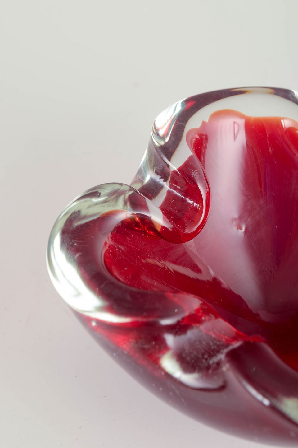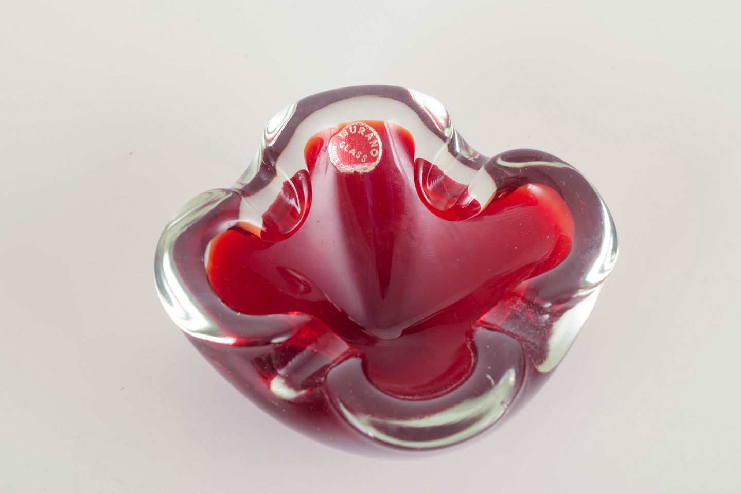 Murano kunstglas skål, 1960/70’erne.Organisk fritformet håndblæst skål i intens rubinrød sommerso-glas med blødt indfoldet rand og svævende klarhedsdybde — et klassisk eksempel på studioglas fra Murano.