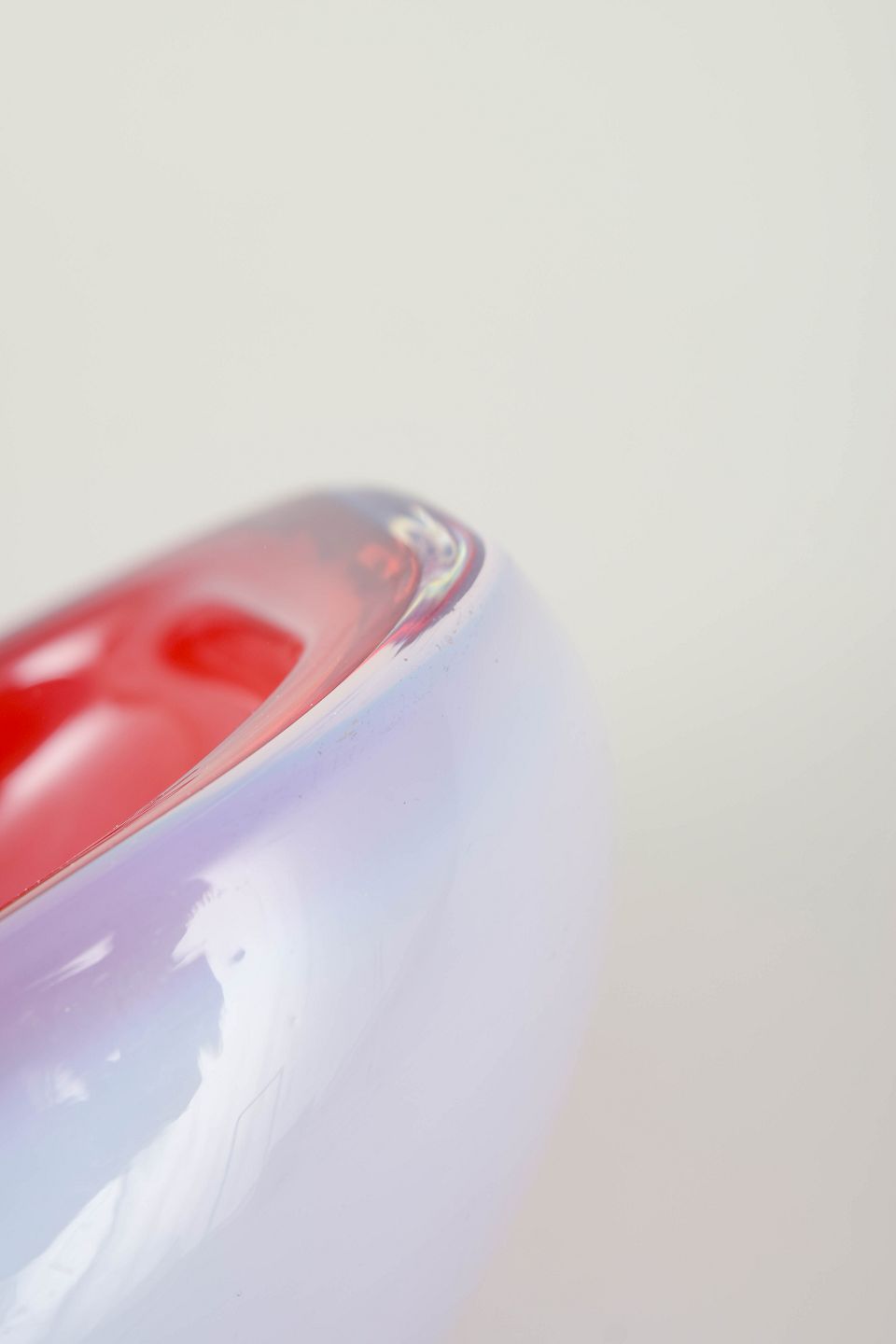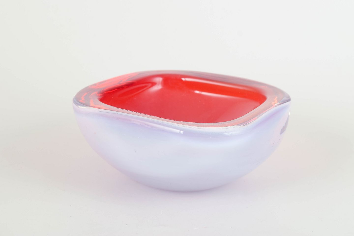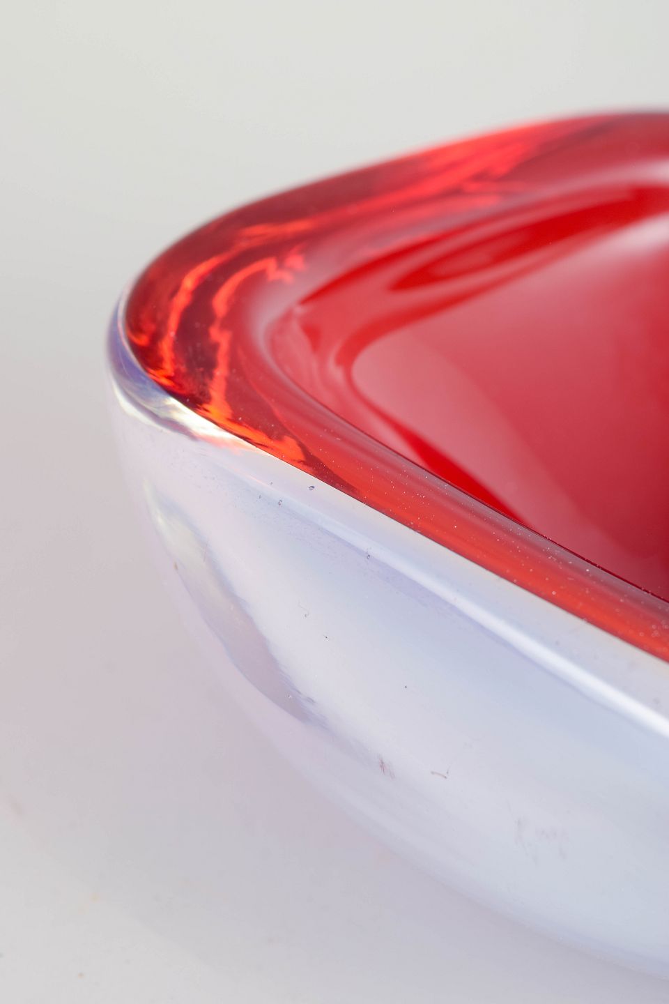 Murano kunstglas skål, 1960/70’erne.Organisk fritformet håndblæst skål i lagdelt sommerso-teknik med rubinrød indre kerne indkapslet i opalhvid ydre glasmasse – et elegant og skulpturelt eksempel på klassisk Murano-studioglas.