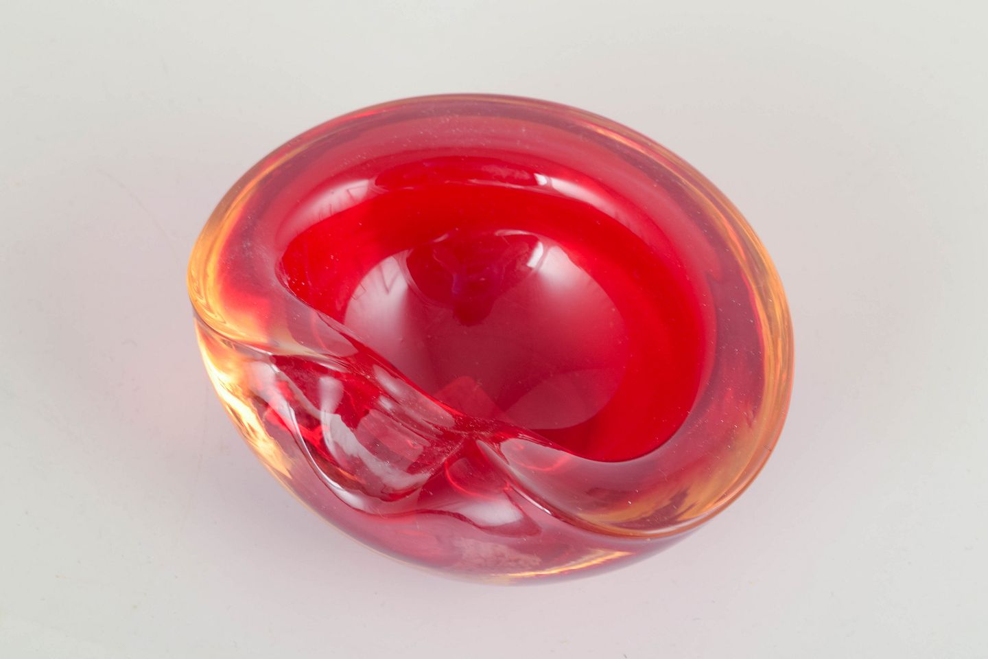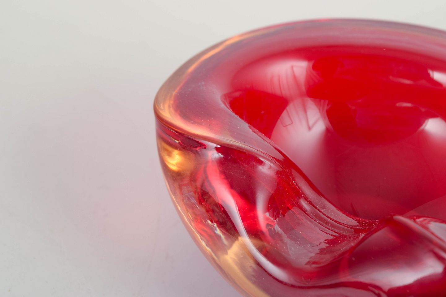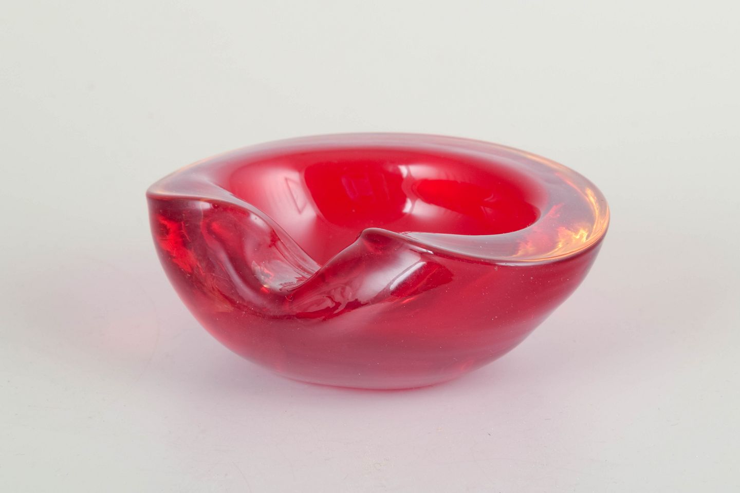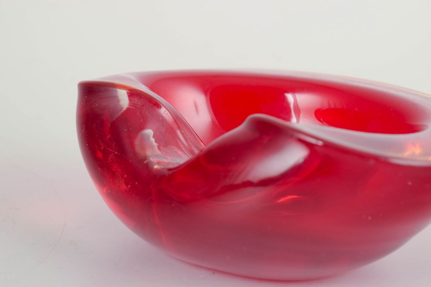 Murano kunstglas skål, 1960/70’erne.Organisk fritformet mundblæst skål i intens rubinrød sommerso-glas med blødt indfoldet rand og svævende klarhedsdybde — et klassisk eksempel på studioglas fra Murano.