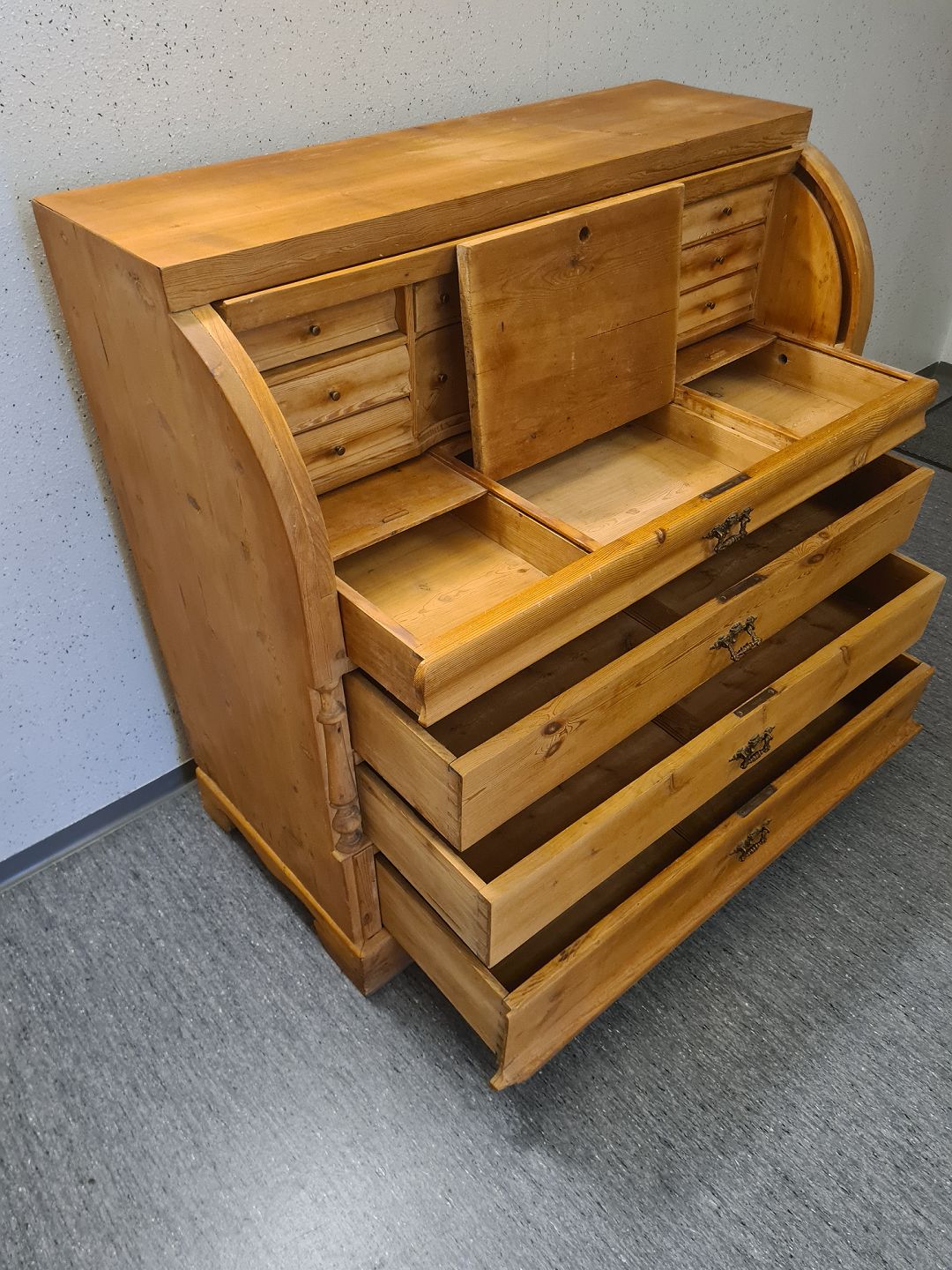 Chatol fra 1930'erne i massiv fyrretræ. Fremstår pænt, ok velholdt og udmærket funktionsdygtigt uden de store brugsspor. Dog umiddelbart uden nøgle.Højde 115 cm. Bredde 118 cm. Dybde 54 cm.