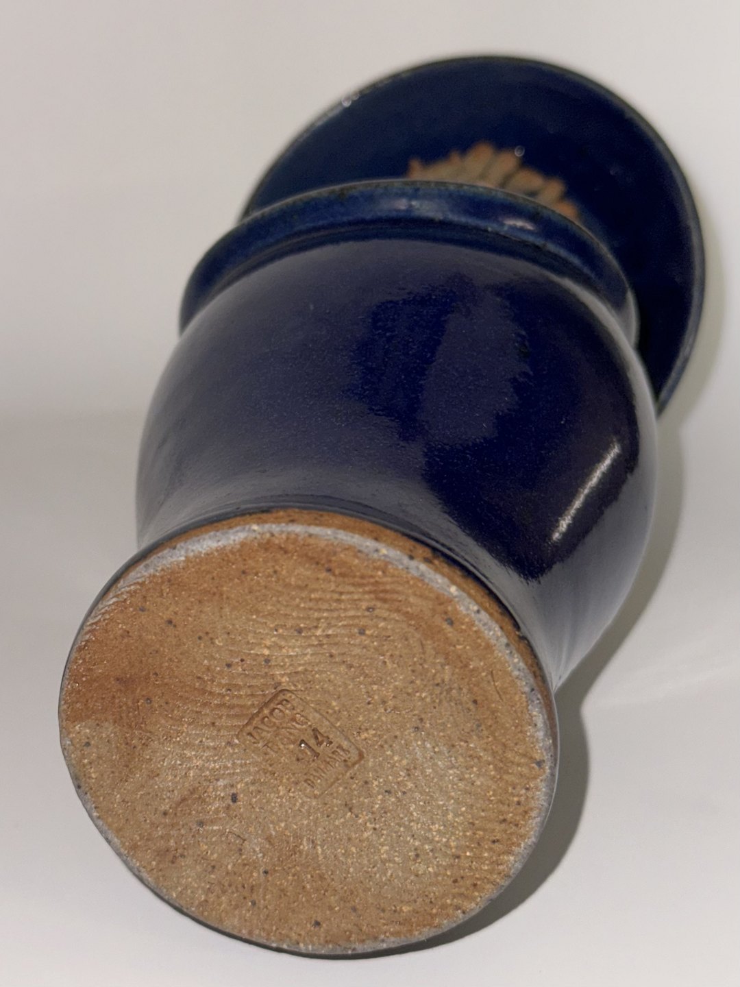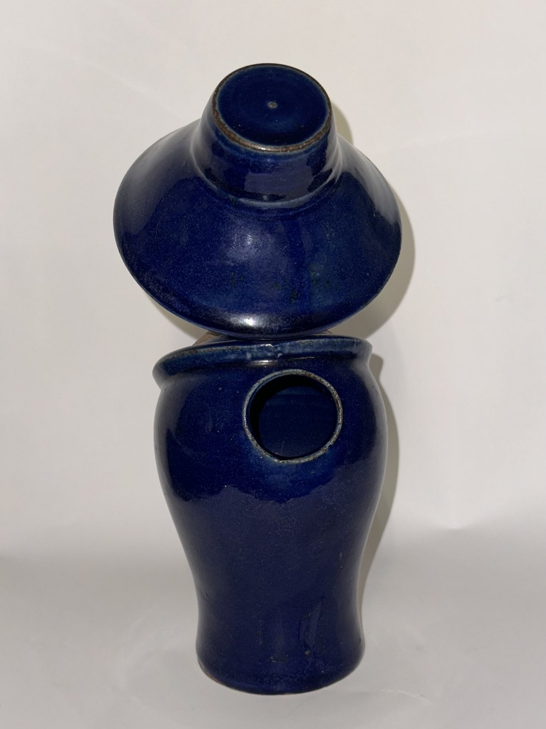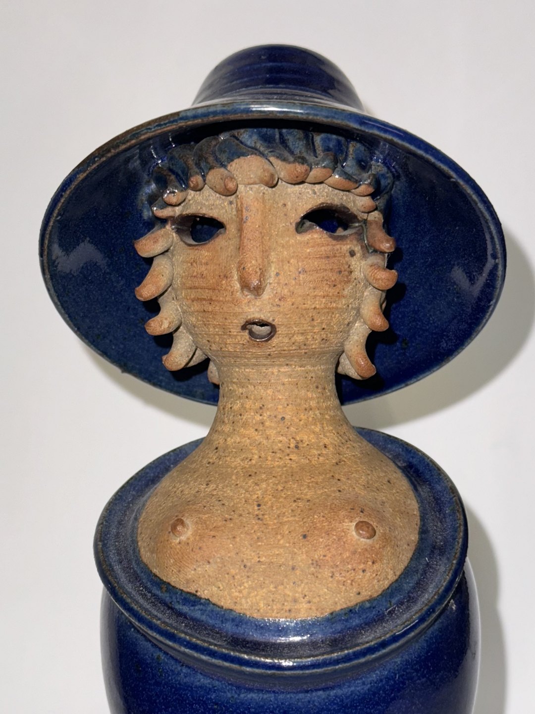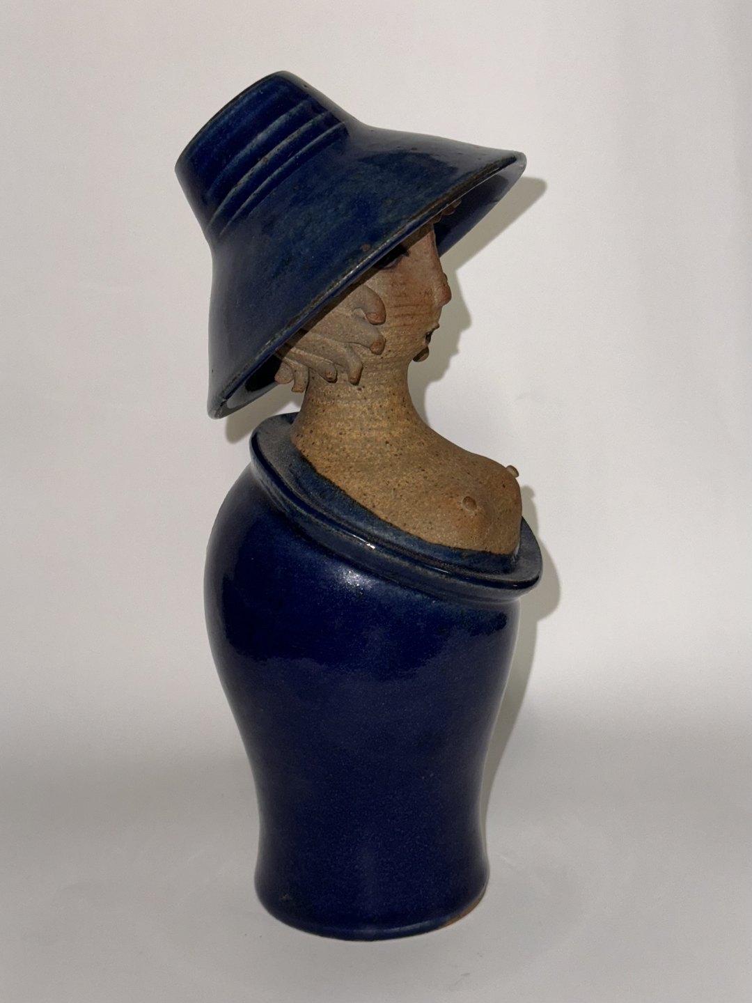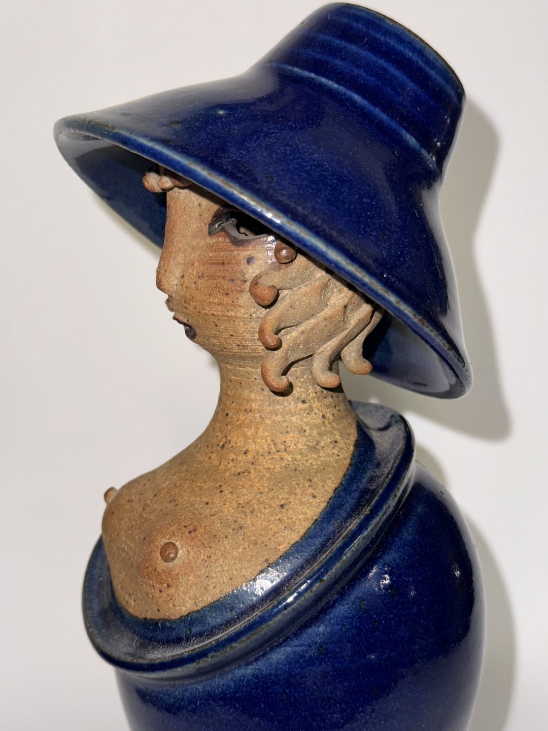 Figur i keramik af kvinde med hat. Fremstår i god stand uden skader. Designet af Jacob Bang, der skabte flere lignende figurer i forskellige positurer. Denne udgave med blå glasur. Hul i ryggen til eksempelvis blomster. Stemplet på bunden med kunstnernavn samt modelnummer 14 samt DANMARK. H. 21 cm