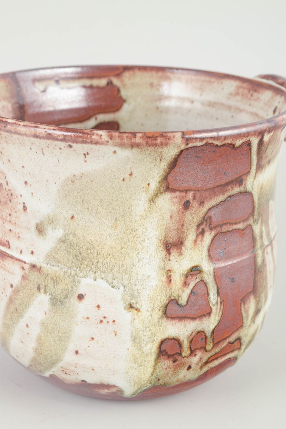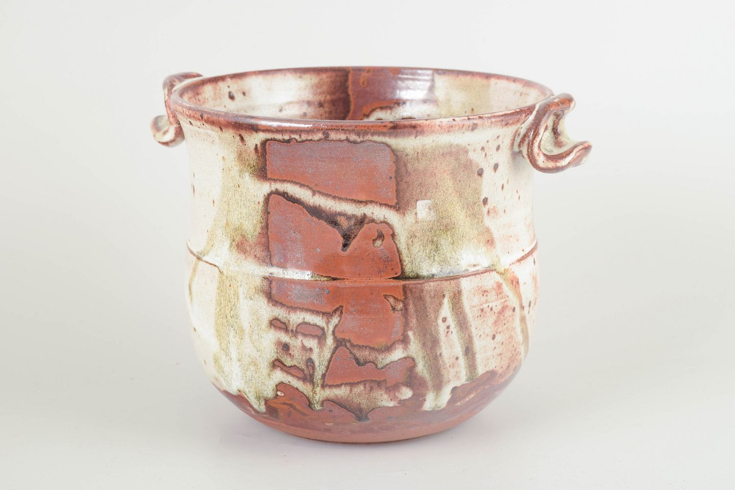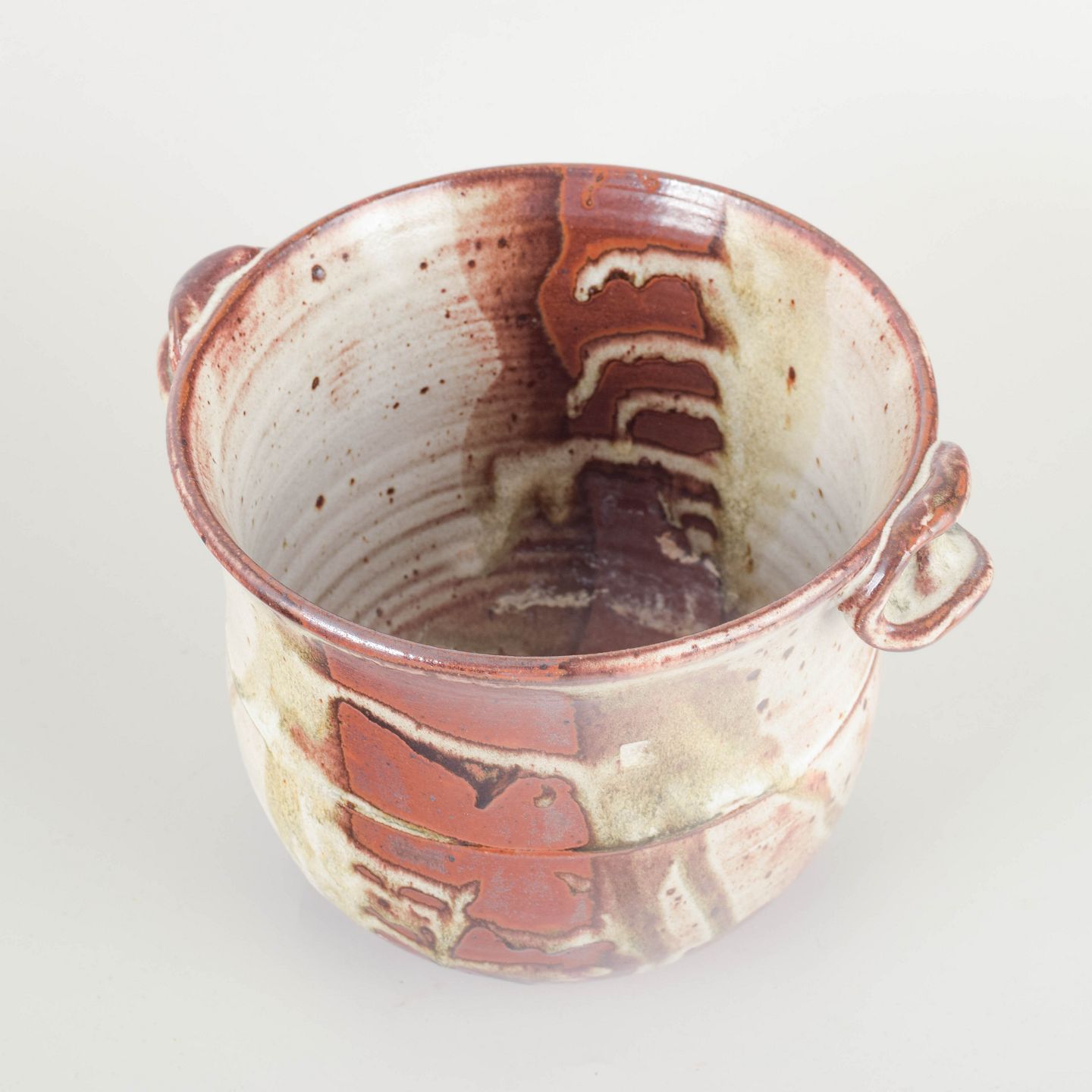 Hånddrejet plantekrukke i stentøj med kraftig chamotte og levende askelignende glasur i jordtoner med lysere nedløb. Dekorative, håndformede hanke giver et rustikt og skulpturelt udtryk.
