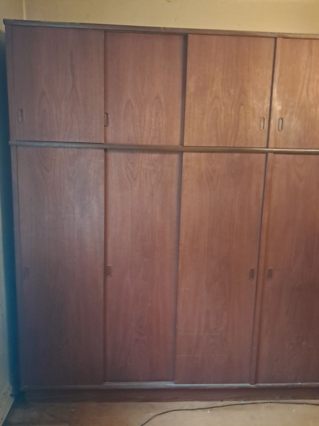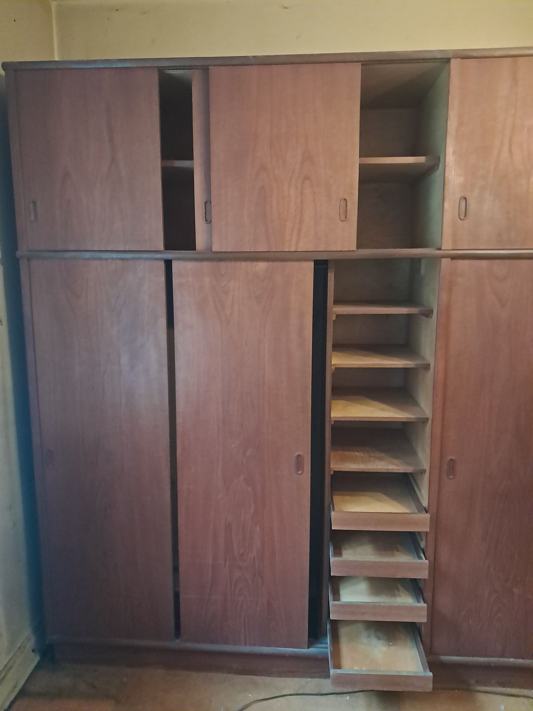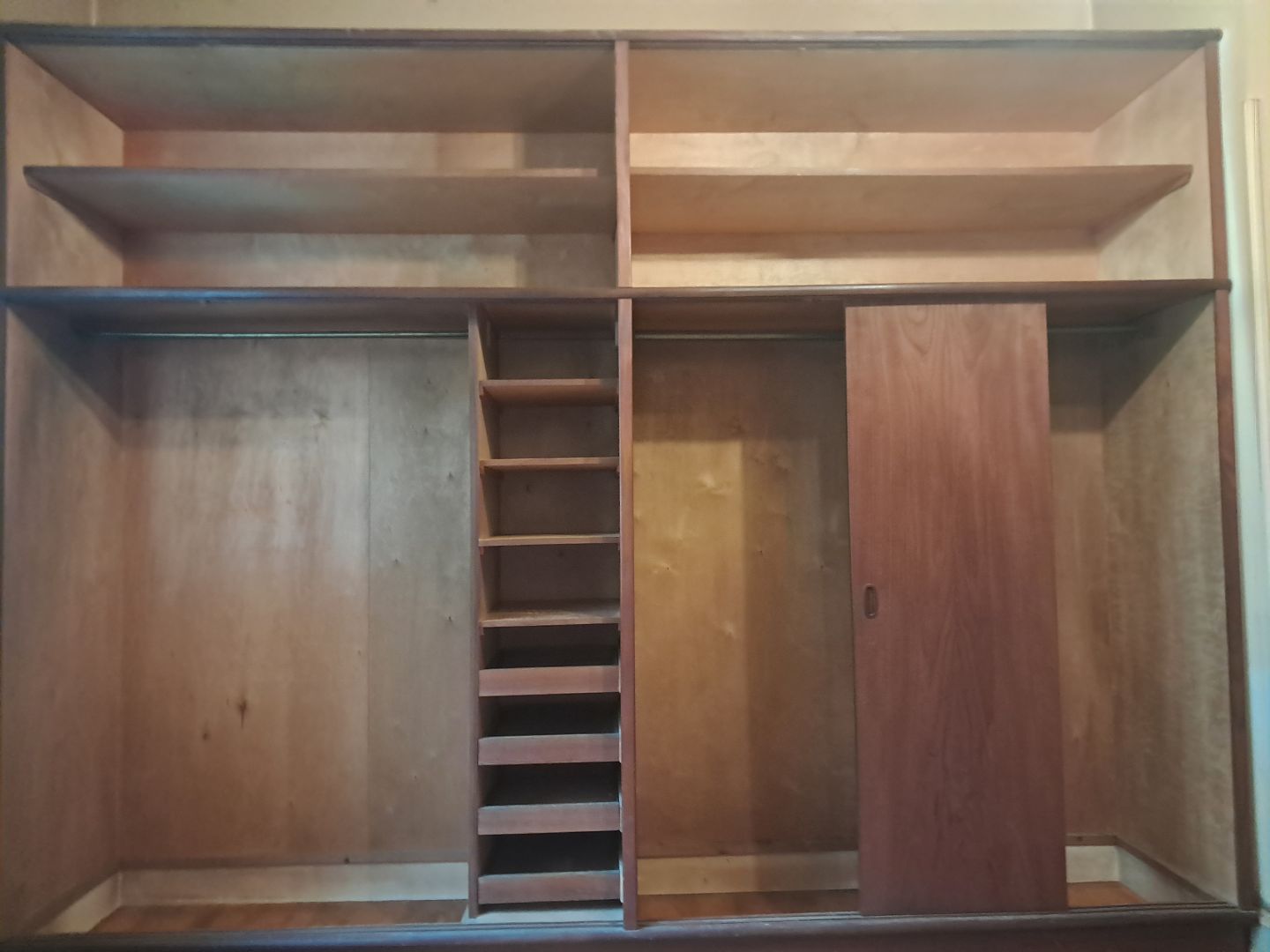 6 Dørs-klædeskab i fineret teaktræ, fra 1960erne.Det har brugsspor og skal vaskes ned, det lugter af tobaksrøg.
