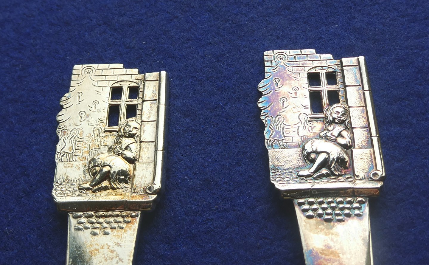 Märchen dänisch Kinderbesteck Taufbesteck in drei Türme vergoldetem Silber mit Das kleine Mädchen mit den Schwefelhölzern.Abenteuer des H.C. Andersen Kinderbesteck.