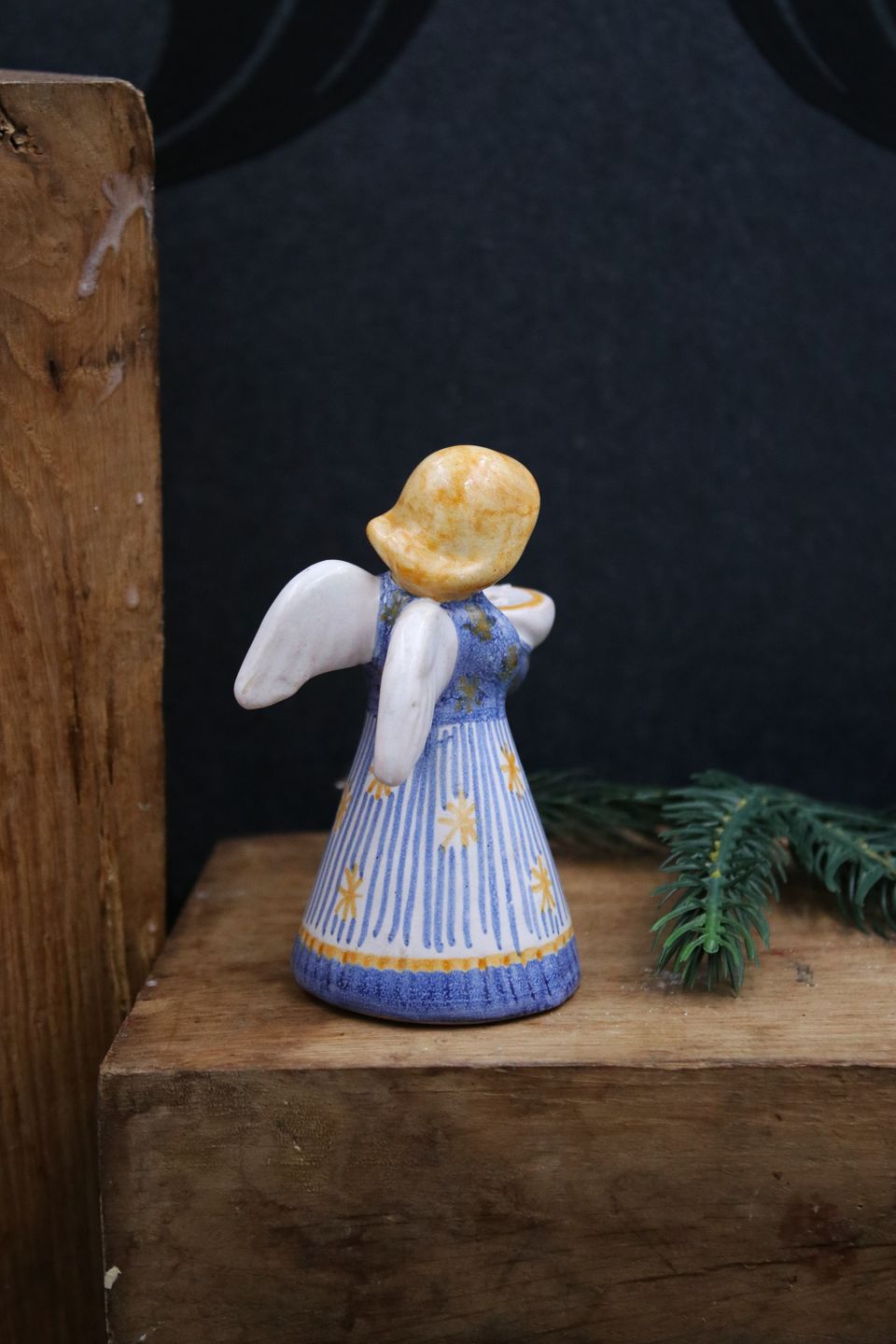 L. Hjorth glaseret keramik engel i blå og gul farve der holder et lille stearinlys. H: 9,5cm.