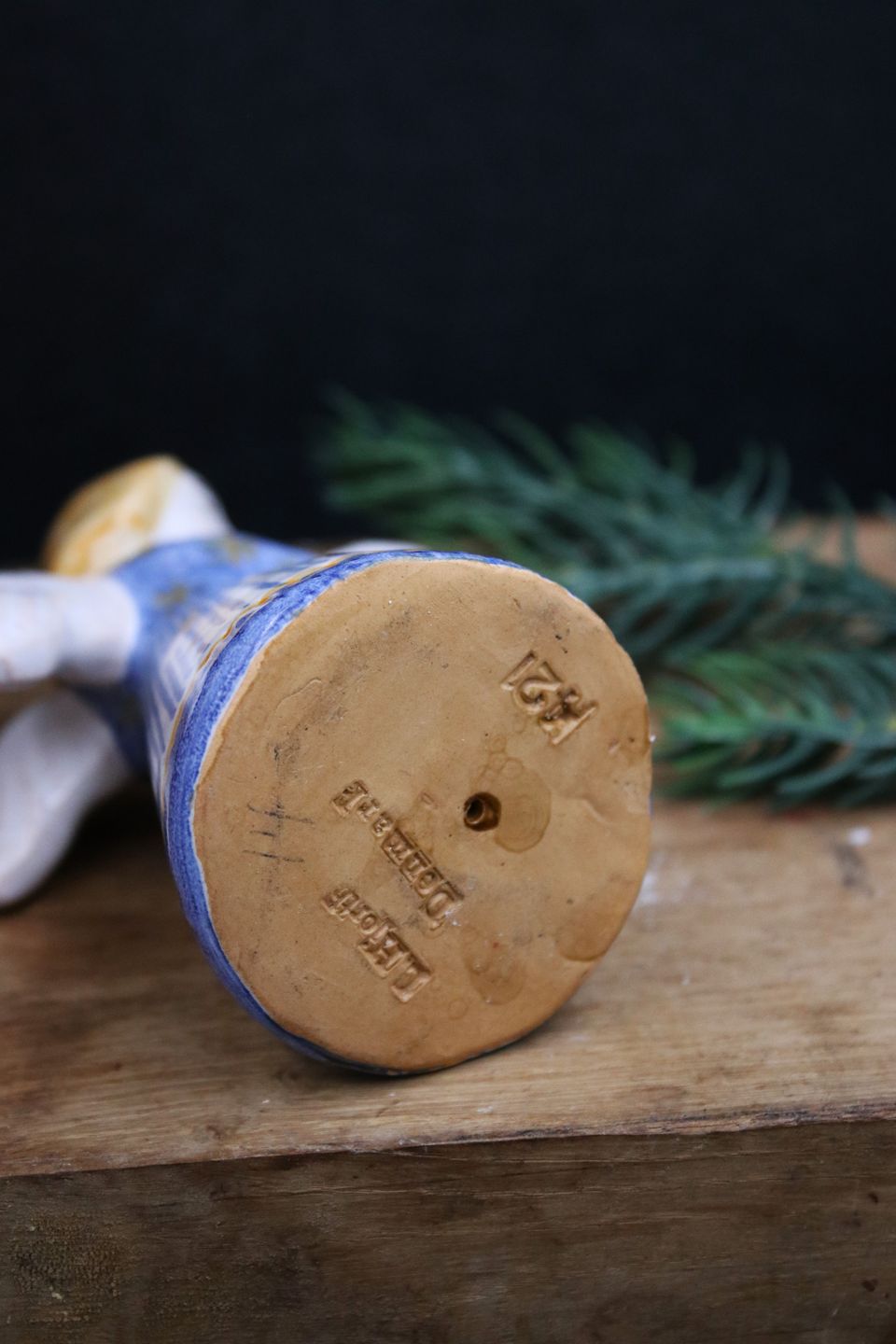 L. Hjorth glaseret keramik engel i blå og gul farve der holder et lille stearinlys. H: 9,5cm. Er i fin stand.Emne nummer: L. Hjorth engel Blå/Gul