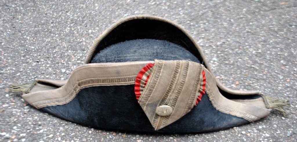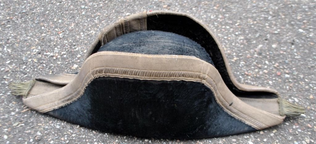 Antiker "Saucentopf", Dreieckshut, Grenzgendarm. 19. Jahrhundert. Dänemark. Hersteller: Königliche Hofhutmanufaktur AF Bodecker, Frederiksbergsgade, Kopenhagen. Innen gestempelt. L.: 43 cm. H.: 13,5 cm.Die Holsteinische Grenzgendarmerie wurde am 1. Januar 1839 von König Frederik VI. gegründet, um die Grenze zwischen dem dänischen Herzogtum Holstein und den deutschen Fürstentümern zu kontrollieren. Die Grenze verlief an der Elbe und der Stadt Hamburg.